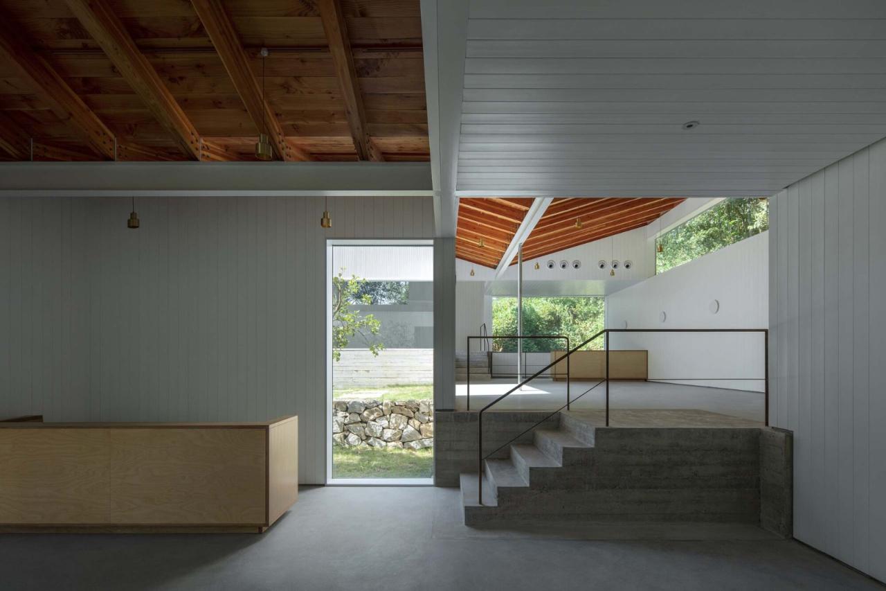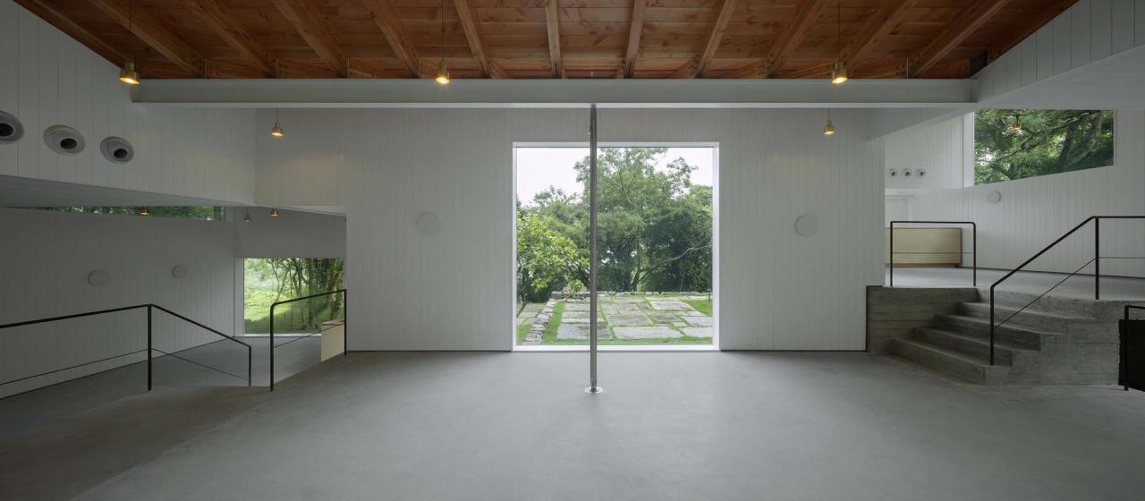 对竖向标高的控制以及对平面的模数化对位,让三维空间中看似无规则散布的洞口等各种建筑要素统合在一张隐藏的秩序之网中,使体验者在内部不断意识到一些遥远但微妙的呼应,逐渐发现简单体量内暗含的新的视觉层次,增加了体验者对空间的阅读乐趣。同时,对于这些洞口,我们将常规的开启通风功能剥离(利用上部的木椽之间电动开启通风扇进行通风),再通过对洞口固定玻璃构造的细化,弱化其表达,使其作为空气界面的玻璃的物质性几乎消失,室内与室外似乎完全贯通。虽然墙壁还有厚度,但由于窗洞边缘与吊顶体量的共同限定,剩余的墙体几乎都以抽象的白色"板片"出现。墙体之间、墙体与屋顶、地面之间,都形成了去构造化的"搭接"关系,这又进一步弱化了洞口本身的存在(洞口变成了墙体板片搭接之后的剩余)。而建筑外部简单明确的体积感,也从进入建筑内部的那一刻就突然消失了,内外的反差极大,使整个房子在内部显得异常轻透,真实的空间深度也变得模糊。