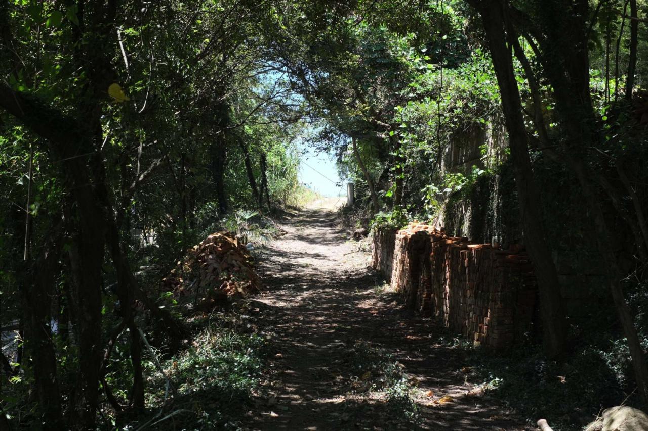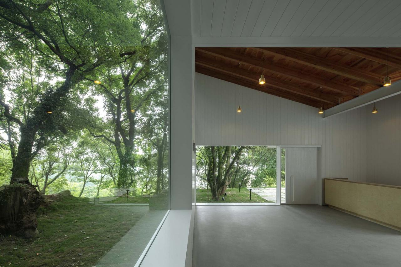 2018年初,久舍营造工作室受邀在舟山定海的一个海边山村设计一座200平米左右的民宿接待中心。业主要求该中心除了满足基本的到店登记入住,还需满足约二三十名客人的早餐与下午茶活动,并且有条件作为临时展厅使用。项目场地为山村最高处一块从东北高西南低的山坡中平整出来的台地,平面为南北方向略长的近方形状,面积约400平米。废墟基址成一字型占据北侧近一半场地,空出南侧的平地。场地西侧长向紧邻村路,且自北向南与不断降行的村路形成约2-4米的高差,通过从西南角贴边向北伸出坡道与村路相连。场地隔路为进入村内的下行步道,路肩下方的高大树冠和步道边的二层房屋一道,将基地西侧的海景几近遮蔽,只在西南角的树干间,透露出山坡更低处一些树木的冠顶亮光。而在其他方向,起伏的山体与杂树林形成了高大紧密的自然屏障,将场地围合并在上空收束,框出一方天空。整个场地,不仅体现出一种面向西侧道路(以及远处不可见的海面)的"方向性",其相对道路的抬高以及相对山林的下沉,又呈现出一种特殊的对山体水平切片的"地层感"。可变的功能意味着通用常规的平面形态。面对只有模糊感受的平坦基地和几无特色的山林环境,如何让建筑在满足功能的前提下,既与场地的气质契合,又能获得超越日常的丰富空间体验,还能保持和提升我们坚持的建筑学品质,成为我们需要回答的问题。