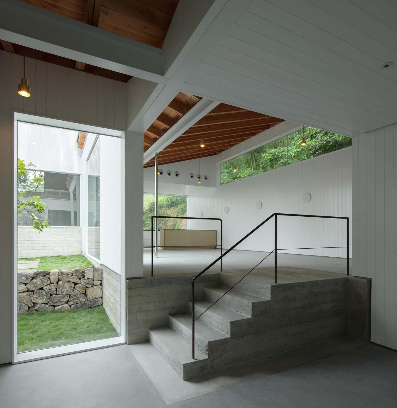 反向双坡屋面仅仅是三个普通体量在平面和剖面的咬合,还不足以支撑我们对内部体验丰富度的期望。我们还希望找到一种可以从结构层面整合外部和内部空间体验的整体策略。最终,我们找到了“反向长短双坡屋面”这样一种特别的思路。毋庸置疑,反向双坡屋面可以使建筑从外廓上获得一种陌生感与识别度,让建筑的图像易于传播,但更令人惊喜的是其在内部的视觉表现,以及在内外空间的连续感受中发挥的综合作用。反向双坡屋面沿体量的长向展开,屋脊梁下探并纵贯房间上空。梁上两边连续的斜向胶合木椽与木望板共同构成浅白色空间中最具吸引力的视觉对象。同时,传统双坡屋面或单坡屋面对下方空间笼罩所形成的内向聚合感,也反转成为一种向前后立面及外部自然挤压的外扩感。当三个体量以长向首尾咬合,连续转向的屋顶似乎旋转起来,内院景观向建筑的渗透与室内向外围山林的离心力同时出现,一种强烈的室内外的交融感得以建立。
