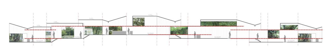 因为空间功能的通用,立面的开洞可谓非常自由,似乎可以随意塑造出极其复杂丰富的内外界面。但只求丰富其实不难,难的是丰富性背后各要素的意图指向以及它们之间关系的可读。同时我们也相信,越是以简单要素产生的丰富,越可以使体验者产生阅读体验时的愉悦感。所以,我们首先根据室内空间与外部地形及景观的关系,设定了立面门窗洞口的大致位置。之后,引入平面模数、归纳高差,将洞口的大小、位置、比例都逐一精确化。首先,从竖向上,三个体量间的地面高差被设定为0.9m,这既是固定家具如吧台餐岛的高度,也是窗台和栏杆的常规高度。空间中下探纵梁和设备吊顶的高度都被设定为3m,这样在相邻高低体量的交汇处,纵梁离地的高度就会随着台阶的上升,从3m逐渐变为2.1m,从而引发明显的身体互动感受。因此,我们以0.9m、2.1m和3m这三个尺寸为基准,制定了立面开洞在竖向上的五种规则:2.1m高或3m高的落地门窗洞,0.9m高的窗台、3m高的窗顶,从2.1m高的窗台一直到顶的高窗,以及从3m高的窗台一直到顶的高窗。随着台地高差的变化,各种地面、栏杆、窗台、洞顶、梁底、吊顶之间,将产生异常丰富的标高对应关系。其次,从平面上,我们设定1.5m的模数网格控制了所有的外部开洞与内部平面的边界,这使得体验者在内部移动过程中,常常可以意识到一系列相隔甚远的边界之间的对位关系。