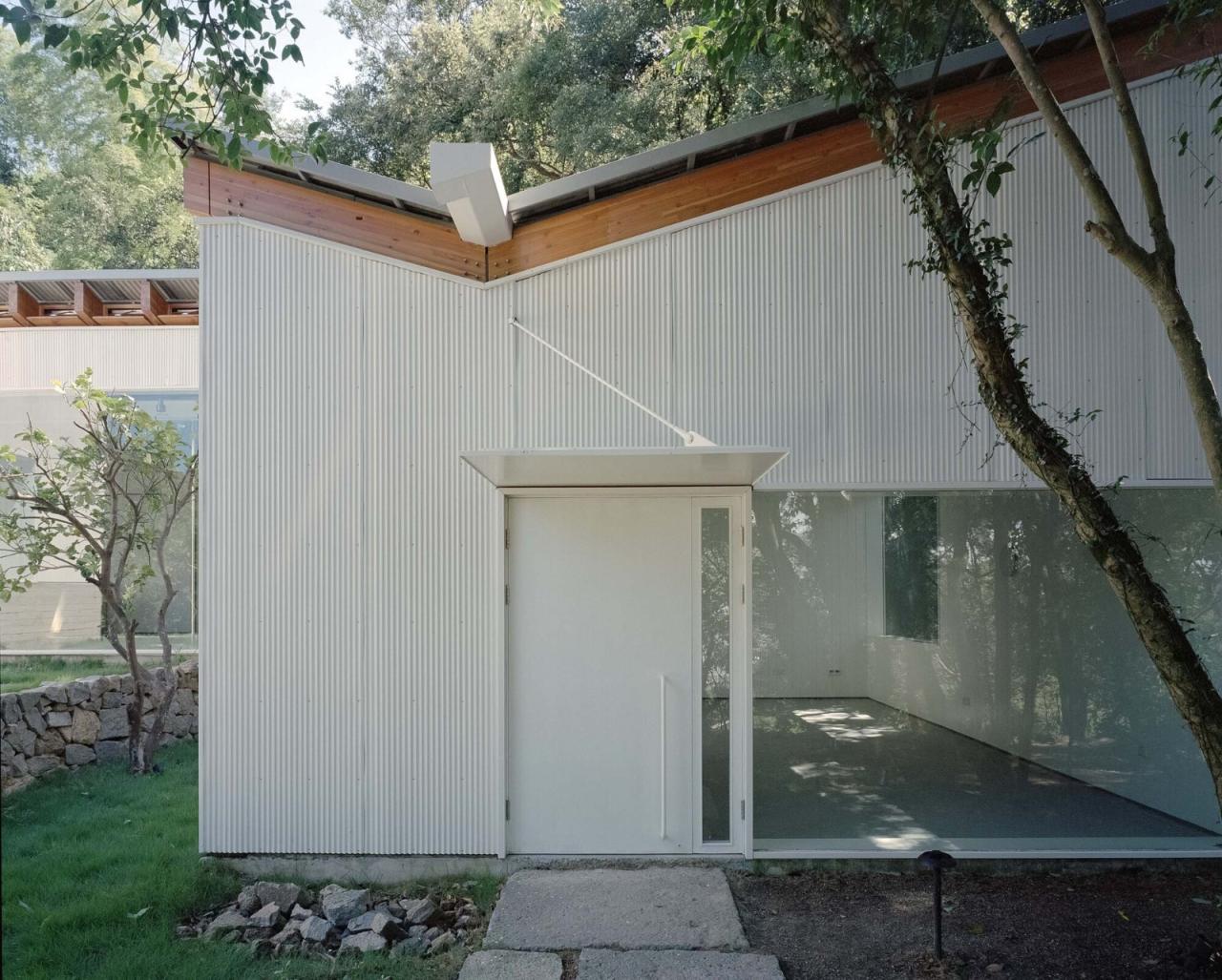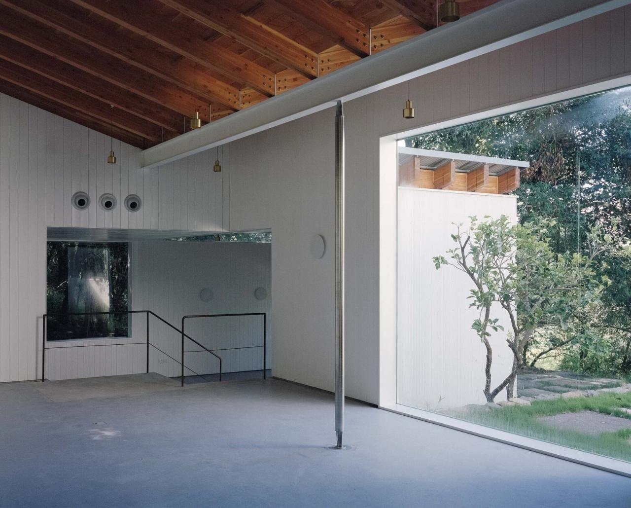 结构的显隐整个建筑的主体采用钢框架结构形式,单跨单层的简单体量让几乎所有的梁柱都可以被立面内外的多层材料覆盖而隐藏在墙体之中。但每个空间内的上部,还有两根分别从长向和短向水平跨越房间的钢梁,短向为主梁,长向为次梁。他们宽度相仿,高度有明显差异。在设计中,我们选择将长短梁底部齐平连接,让吊顶的底面也与之齐平,并脱缝统一刷白;次梁整体在空间中暴露,而主梁的侧边以白色墙板覆盖,并与下挂的片墙及设备空间侧壁整合。这让主次梁的结构作用在视觉效果中产生反转:主梁消失在墙板和吊顶中,只露出底面的宽度,而纵向次梁成为了空间中的主导结构,这进一步将房间的尺度感受拉长变大。这类操作,并不是简单的受力或构造层面的考虑,而是将结构的物质与形式进一步抽象、精分,并重新编织进新的意义系统,统合着影响空间的综合效果。