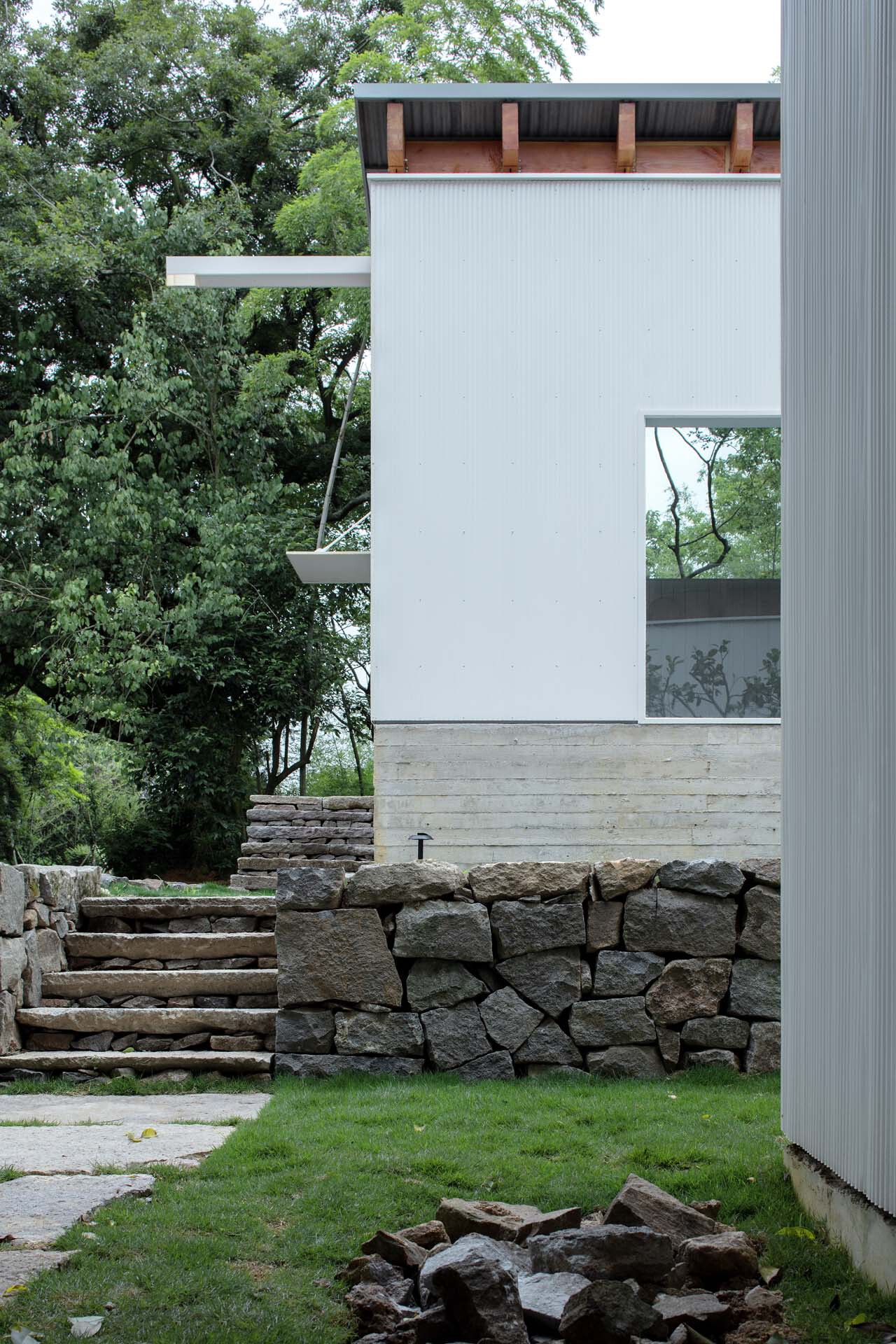 之后,我们将上部空间的体量进一步化整为零,切分成三个日常房间尺度的矩形小体量,再两两对角咬合成一串整体。三个体量中每一个的平面轮廓都比村中常规农宅的尺寸要小,且立面由与附近轻工业园区厂房类似的竖向金属波纹板包裹,细窄的波长让其摆脱了人们对工业建筑的惯性记忆,产生既抽象又细腻的多层次视触感。三个体量南北前凸,中间退后,在平面上围合出朝向西侧大海的"空院",明确出建筑形体的主朝向。南部的体量相较北部进一步后退,让出场地上保留的一排杂树,与原有坡道共同建立出入口空间。咬合的动作使得建筑轮廓变得曲折丰富,原本平直的外部自然山林景观因此有了从室内观看的多种视距。在竖向上,三个体量逐层抬升,分别位于不同标高的台地之上。内部台地侧面混凝土细木模板的横纹延续并强化了一种山地地层的感受。最高的台地下方是隐藏在基座中的厨房、卫生间。台地间通过处于平面咬合部分的台阶连接,外部毛石砌筑的台地则直接从其边缘设台阶构成连续的"山路"。台地的三个标高在室内外一一对应,使场地的"地层感"在内外延续。三个台地由南向北的连续抬升,如“补山”一样,降低了原本场地与北侧陡坎的巨大高差,作为基座,也为上方体量获取更多光线与更开阔的景观创造了条件。