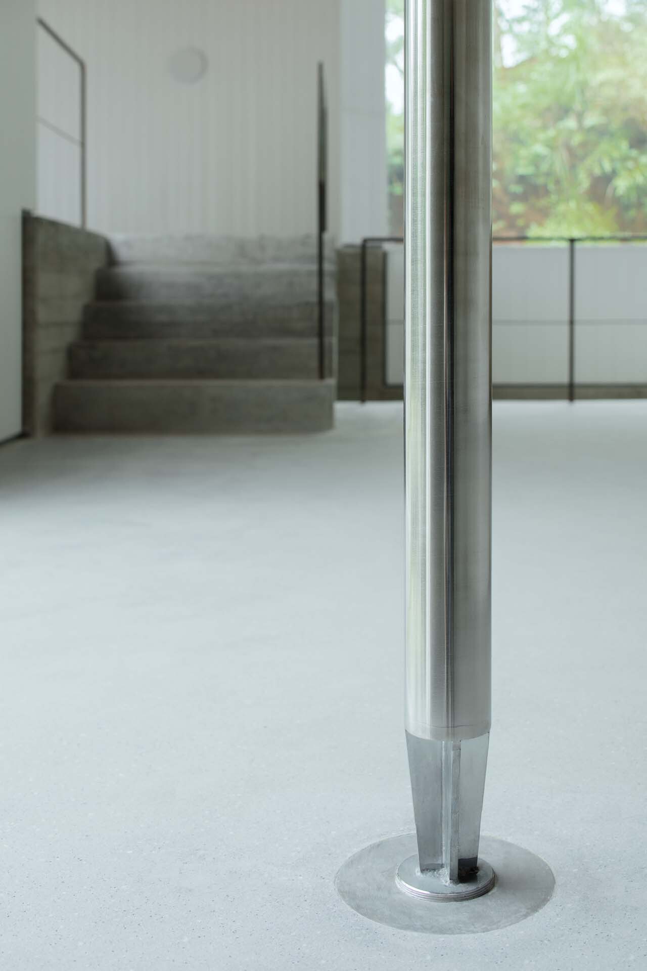 在中间体量空中的纵梁下方,我们设置了一根超细的实心不锈钢柱,它不仅起到摇摆柱的作用,帮助托起整个室内空间中最长的一根梁,甚至也可以在台风时,起到拉住屋顶的作用。除了具体的结构作用,它还将上空的飞梁与体验者的肉身连结,将抽象的视觉感受转为手握柱身的触感。更重要的是它与立面唯一一块正方形固定窗扇的关系——当一位体验者面对方窗,依柱而立,他面对的是被树冠遮挡着的大海方向。