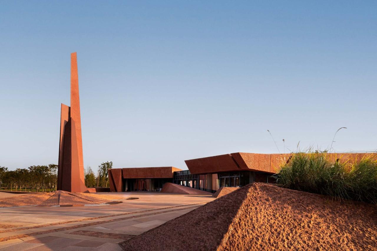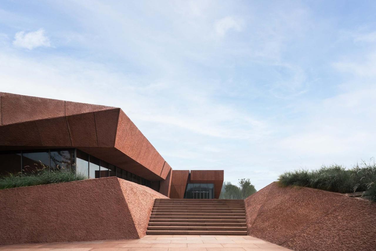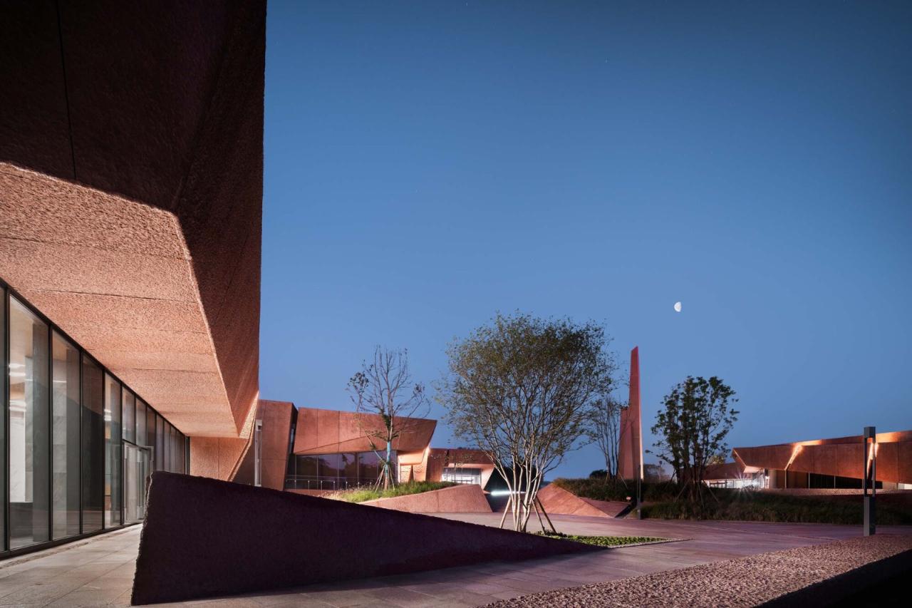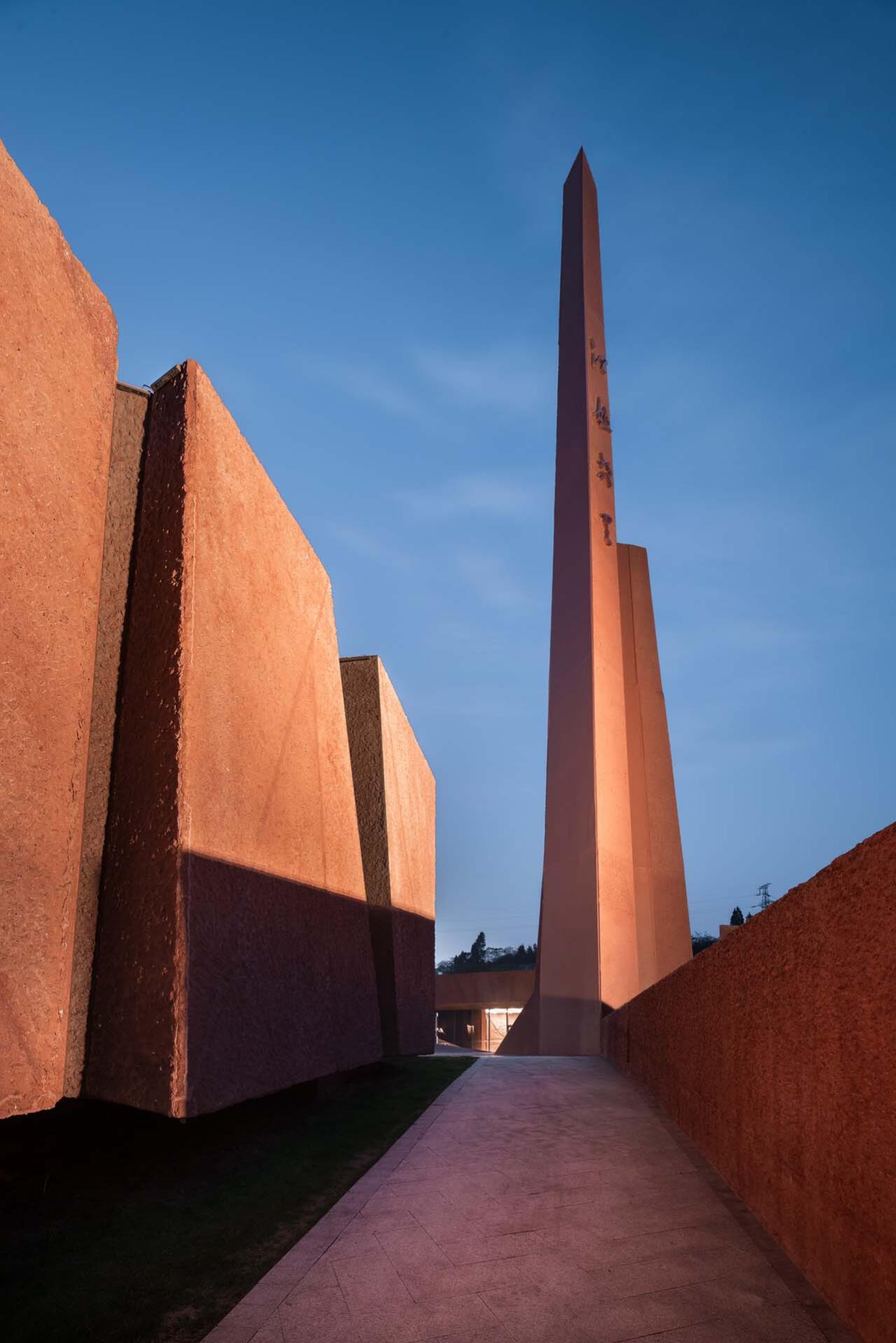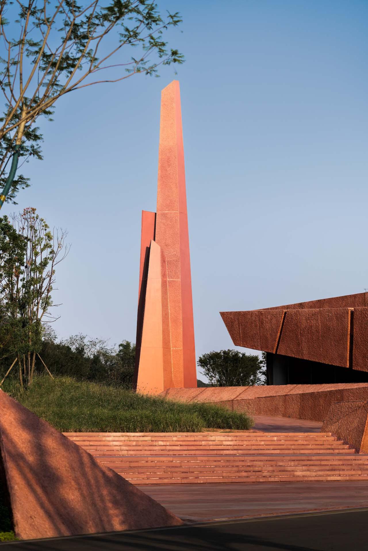 塑形为了让抽象的红岩充满力量,采取了刀削斧剁的手法来塑造形态,将大的体块干净利落的劈成若干小块后,自然形成一些裂缝,这些裂缝从建筑的立面延伸到了屋面,形成了很多自然的光槽。阳光挤进缝隙后,在室内和一些灰空间形成了丰富的光影效果,强烈的明暗对比也让体验者产生了江姐身处渣滓洞向往光明的那种精神感受。建筑的外皮有时候是剥离开的,为上山或者去屋顶的台阶提供了一些场所,这些逼仄的空间与中轴上宽阔的纪念场地形成了强烈对比,象征着崎岖的革命道路和美好的精神愿景。俯在地上的组群形态的确是与环境相融,但是建筑的纪念性仍然需要更强烈的提示,轴线上高耸的构筑物解决了这个问题,从基地的各个方向观察建筑,都会被它吸引,所以特意采用了材质的对比增加了对比度,形体的错落有致,偶尔带一点凌厉的气息也与江姐刚毅的性格暗合,在前侧水面的映衬下显得格外引人注目。