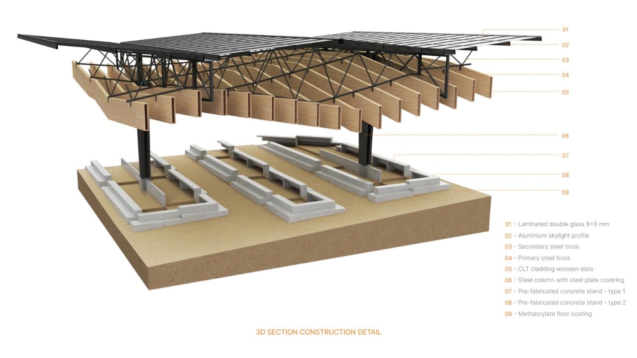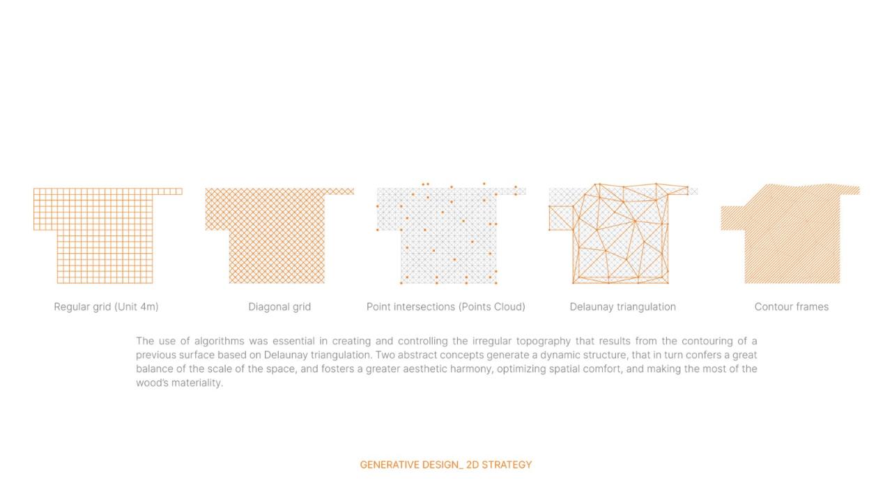 所有斜坡都经过仔细规划,以方便残疾人和老年人使用。打造的顶篷有助于遮阳挡雨,新附属结构则将内部空间拥抱在内。天篷设计通过生成过程来创造形式概念,而元素的优化上采用了表述方法:规则轮廓(木材)、参数化桁架(钢)和规则镶嵌(玻璃)。