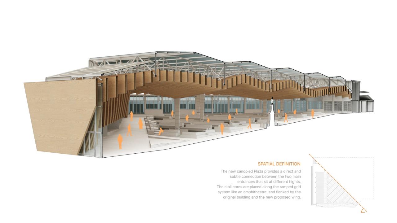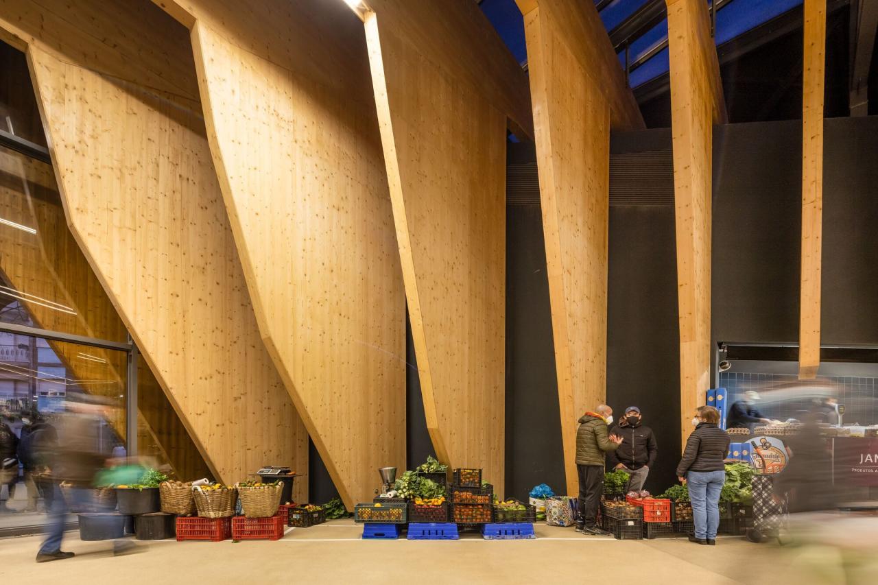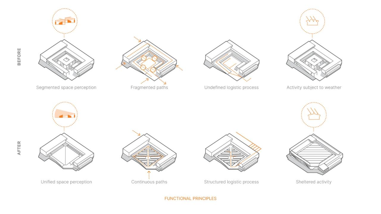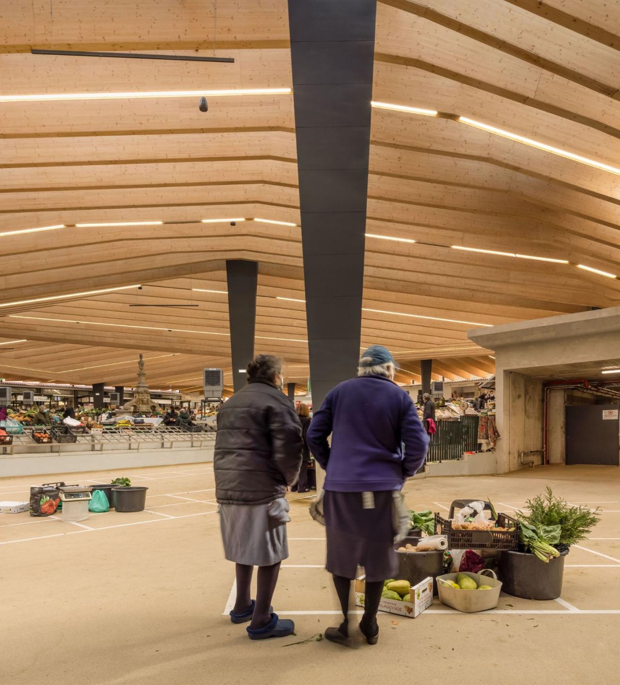 公共区域最初分散在整个建筑中,现而集中到广场中央,从那里用户可以眺望、浏览并快速到达任何一个摊位。 这使得人们可以轻松地体验整个市场,并增加买卖双方之间建立新联系的可能性。所有服务支持区域与公共路线分开;新鲜水蔬区(脏乱)和熟食区(干净)的线路也被分开,并增加了新的功能以获得更高效的操作流程与更严格的卫生条件:装卸发货在一个区域进行,并为接下来的处理工作准备了废物处理流程,还为特定部门增加了技术区域,例如切割厂、烟熏房、减工厨房和专用制冰装置。