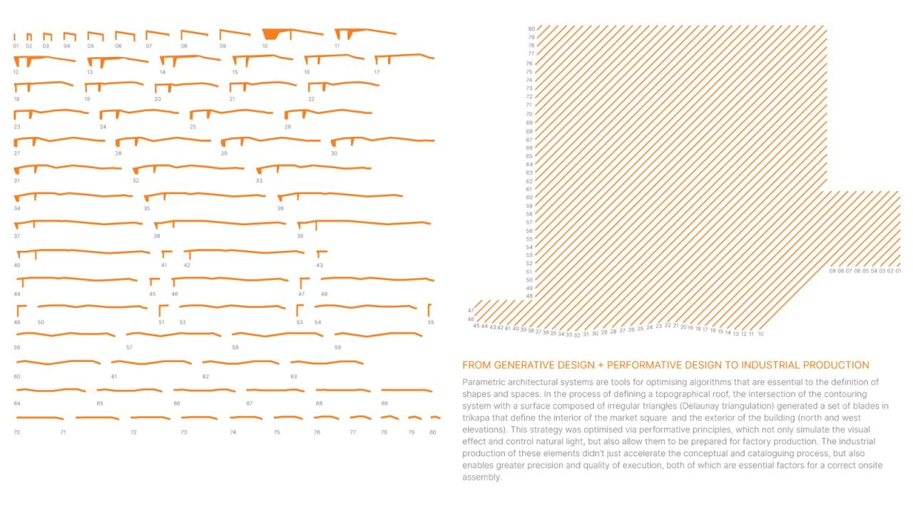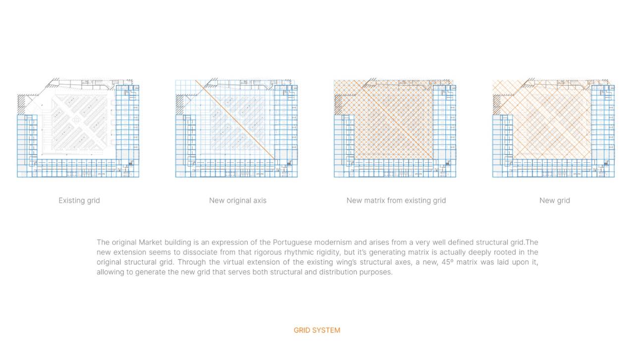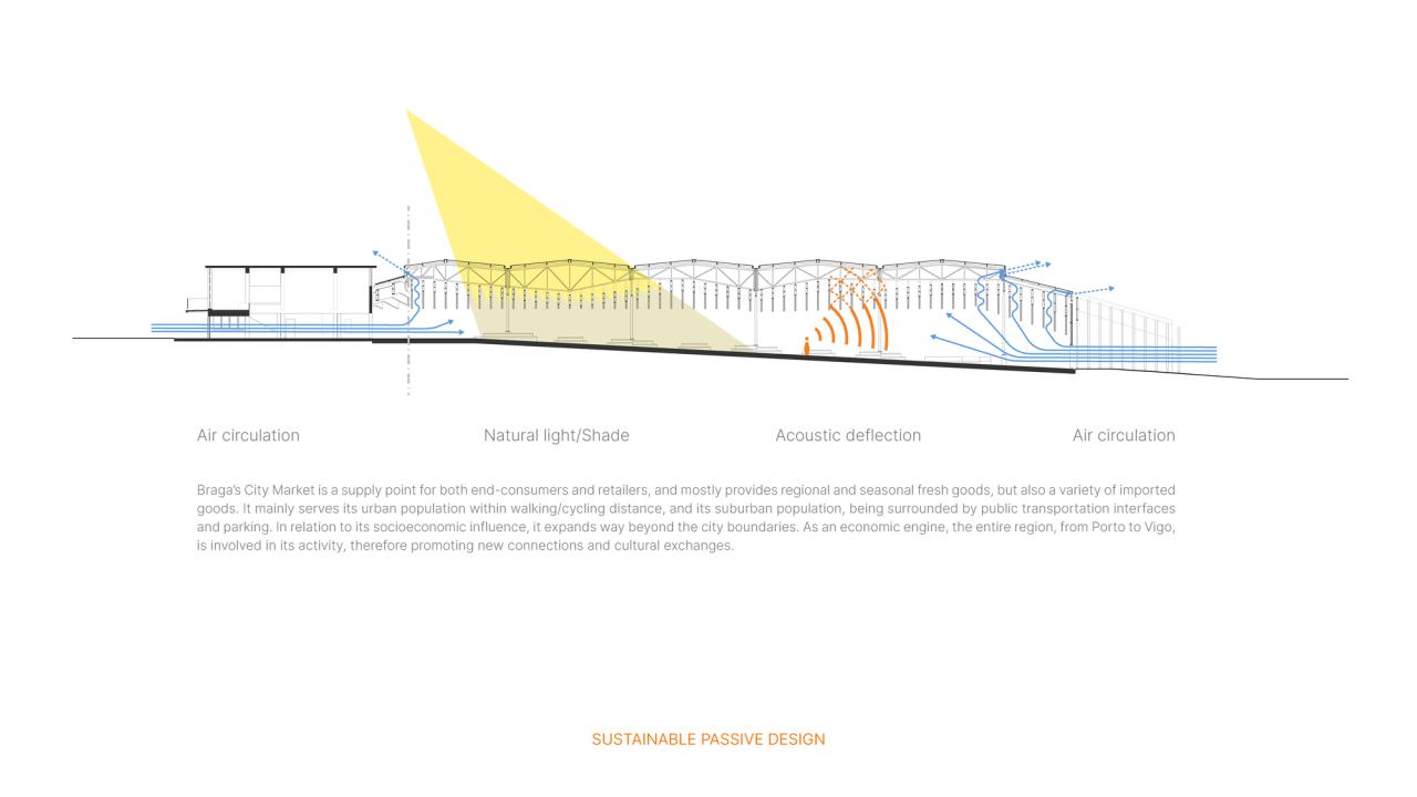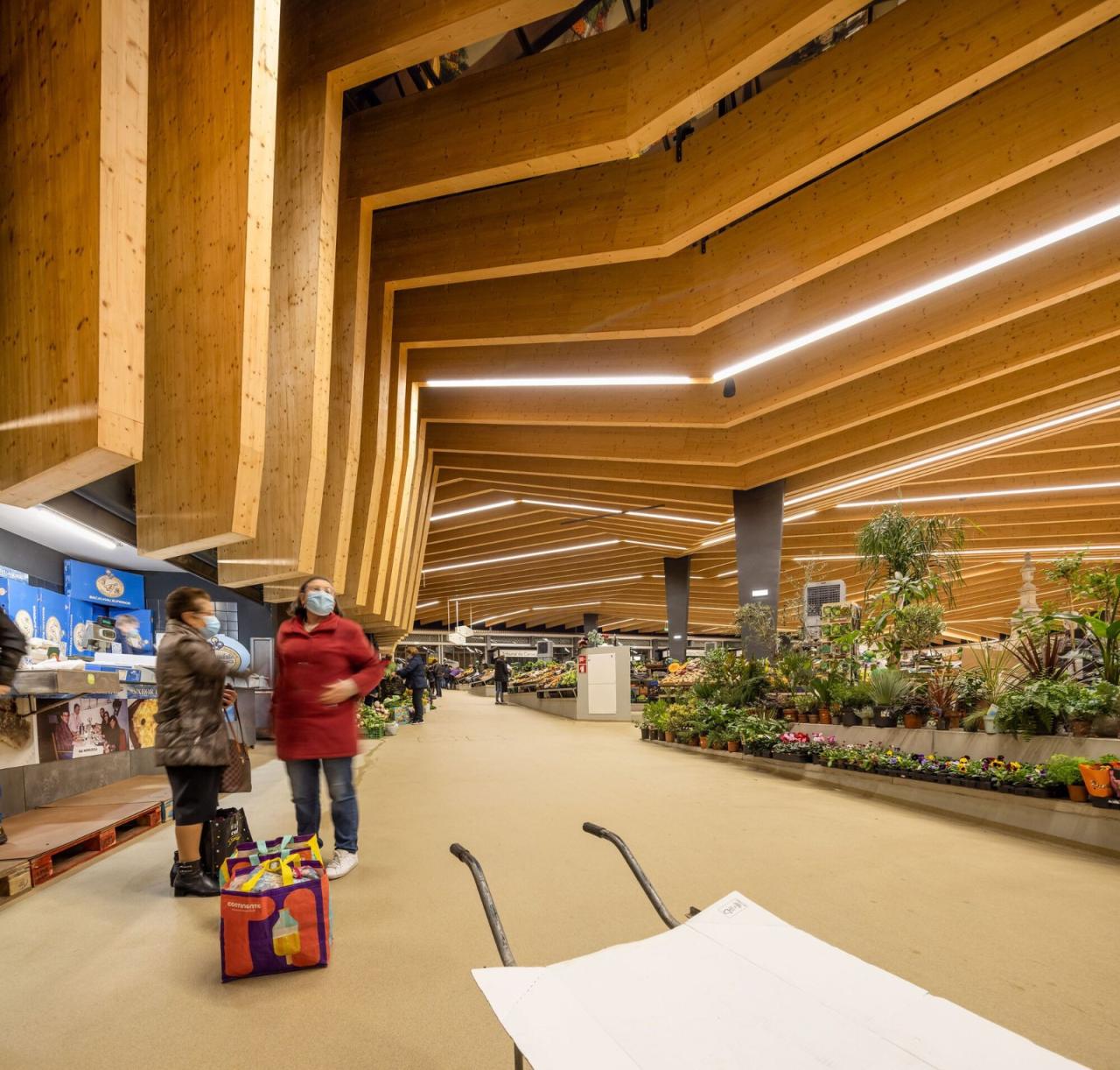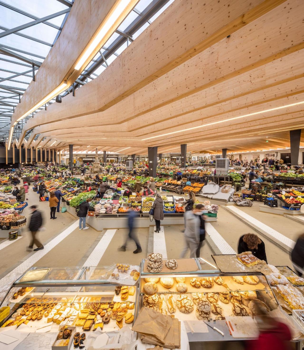 公共区域最初分散在整个建筑中,现而集中到广场中央,从那里用户可以眺望、浏览并快速到达任何一个摊位。 这使得人们可以轻松地体验整个市场,并增加买卖双方之间建立新联系的可能性。所有服务支持区域与公共路线分开;新鲜水蔬区(脏乱)和熟食区(干净)的线路也被分开,并增加了新的功能以获得更高效的操作流程与更严格的卫生条件:装卸发货在一个区域进行,并为接下来的处理工作准备了废物处理流程,还为特定部门增加了技术区域,例如切割厂、烟熏房、减工厨房和专用制冰装置。