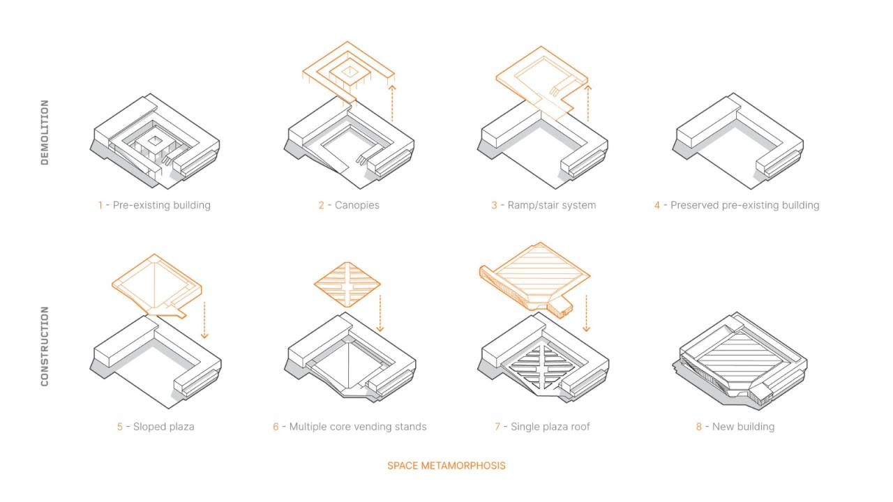 新的餐饮场所促进了建筑内的经济买卖,提升了人们在内部的体验。建筑的形式干预直接关系到新区域和流动布局。 在由三个“U”形附属建筑组成的原有建筑中,通过调整所有空间但尽量减少干预改动来适应新功能和保持其原有特征。每个店面转移到中央的开放性广场。随着广场成为所有公共互动的新中心,凸显了更具广泛深刻性和影响力的新规划。