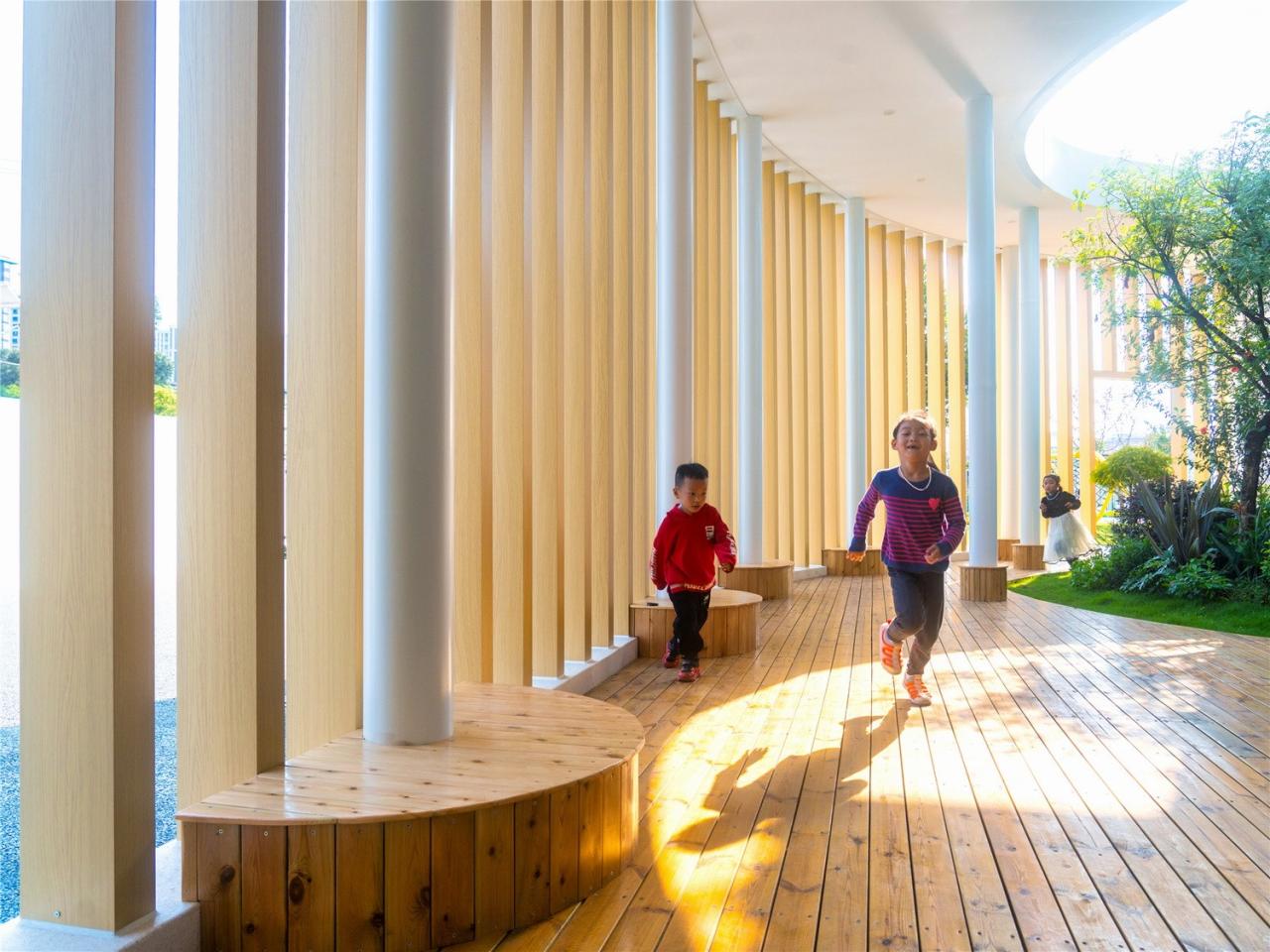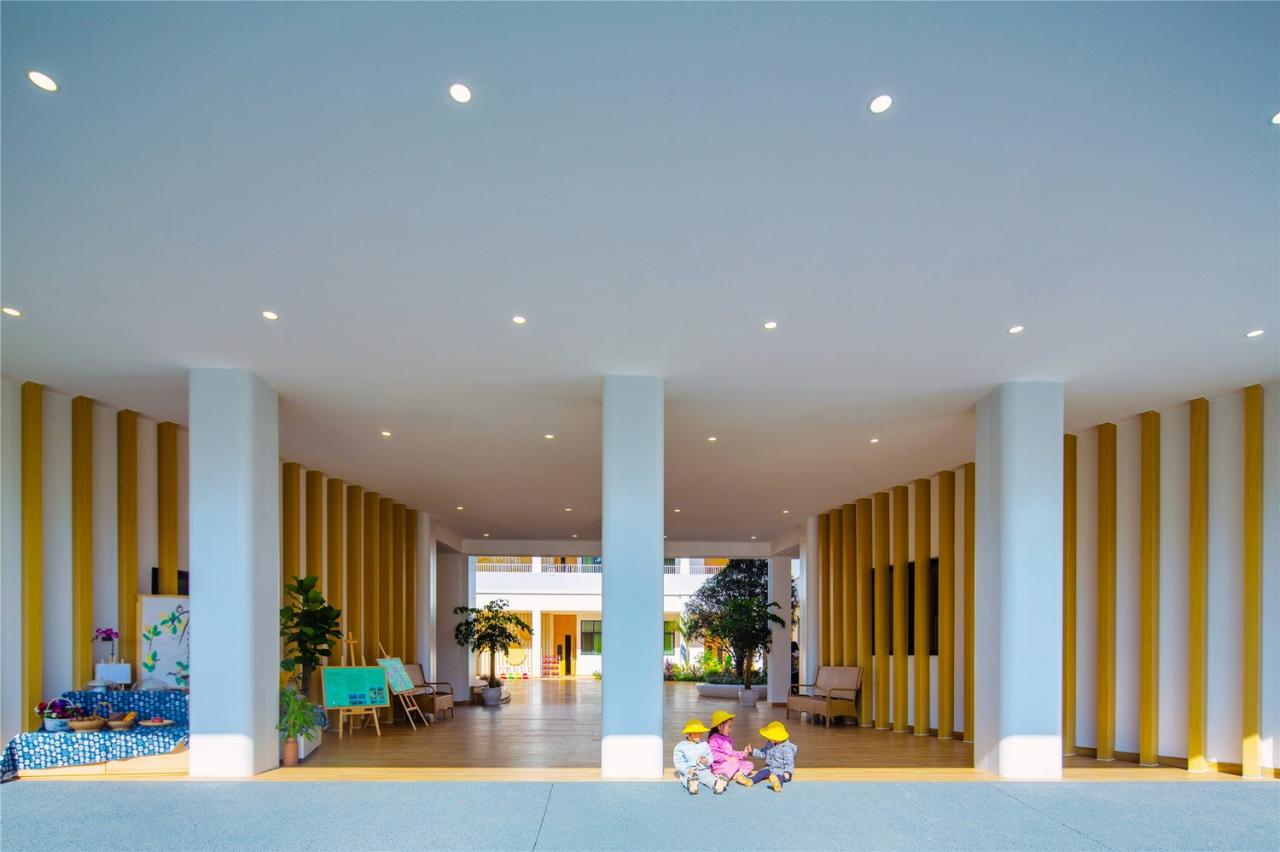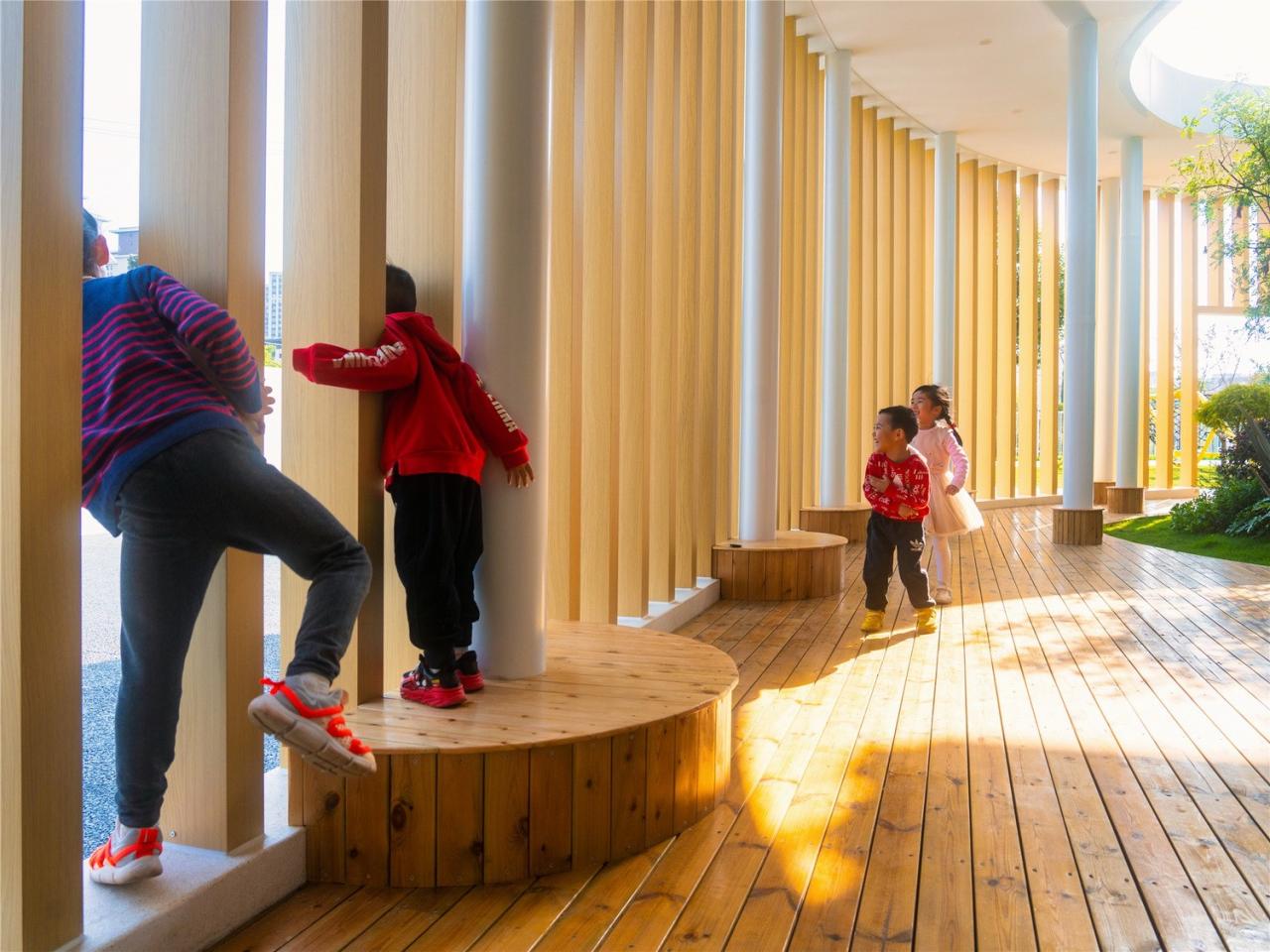 室内空间保持自然光线的充足,每个教室都明亮与宽敞,整体氛围温暖舒适。所有墙体与柱网均采用圆弧倒角设计,以提供柔和的视觉体验并保证孩子们在运动过程中的安全。
