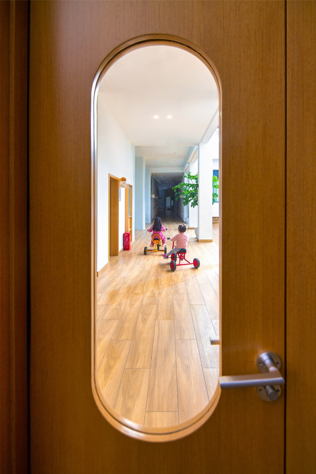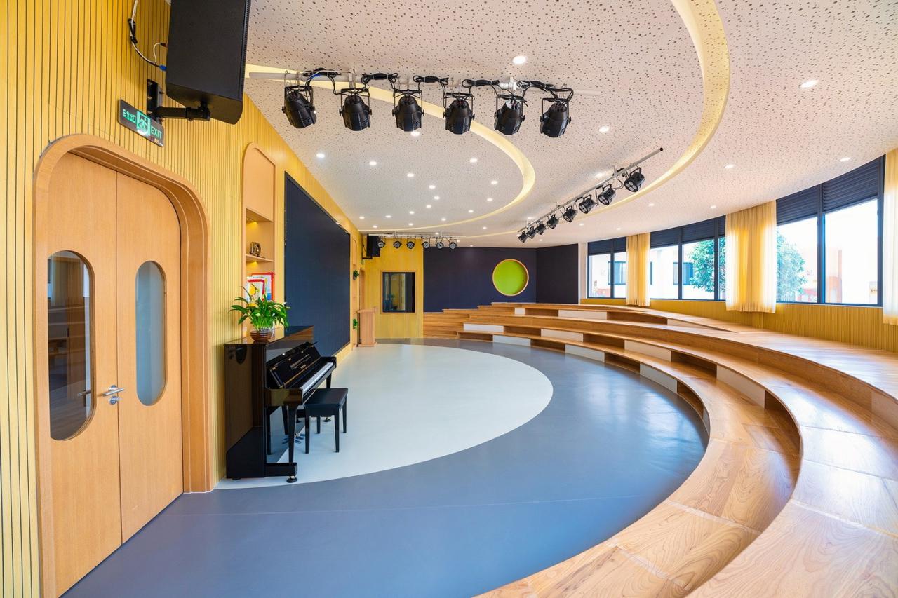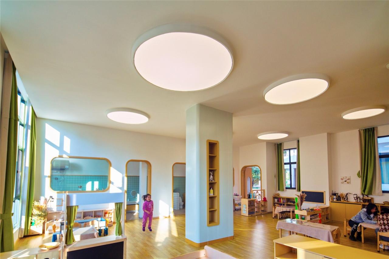 室内空间保持自然光线的充足,每个教室都明亮与宽敞,整体氛围温暖舒适。所有墙体与柱网均采用圆弧倒角设计,以提供柔和的视觉体验并保证孩子们在运动过程中的安全。