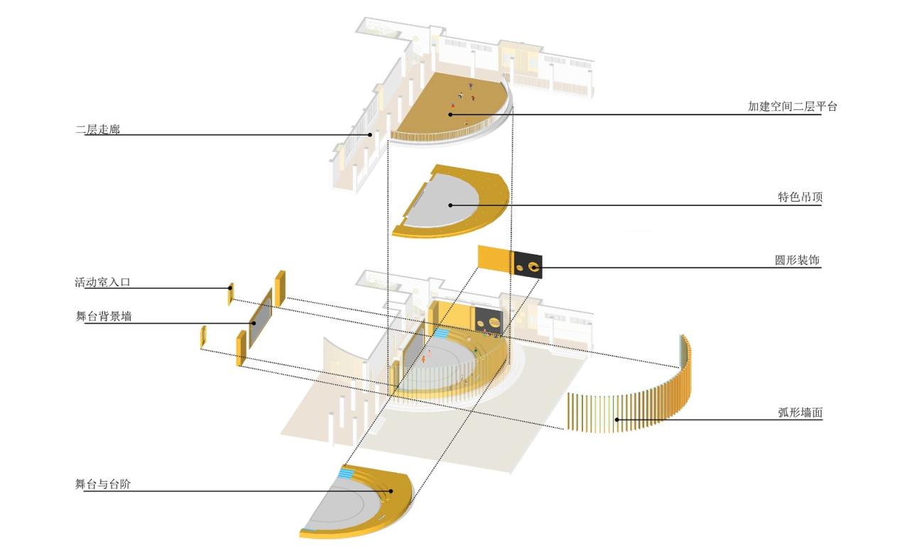 由于使用功能发生改变,现有建筑欠缺很多功能:标志性入口、多功能活动室、部分专业教室、供应用房、活动场地等等。设计从幼儿园本身所需功能全面补充。改造新增开敞式主入口大门增强幼儿园入口标志性;增加活动场地、多功能活动室、顶层加建将建筑在空间上联系起来,形成有序丰富的整体。