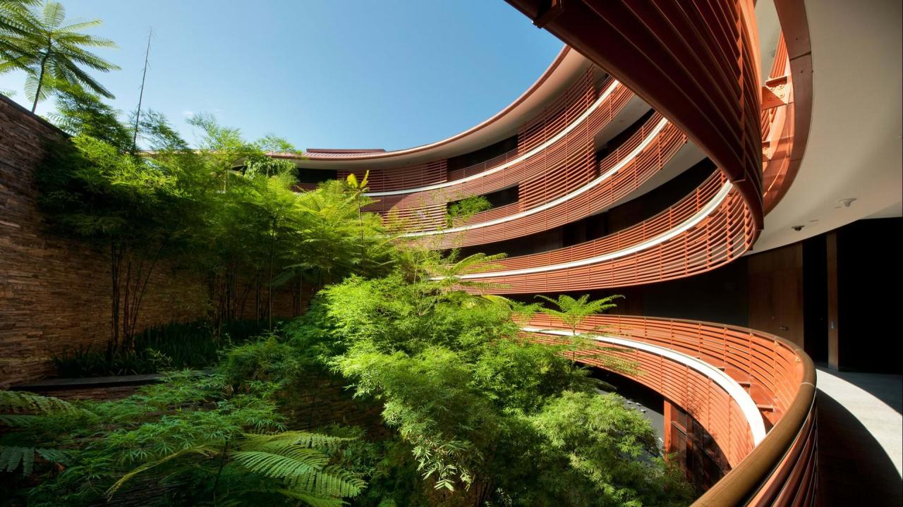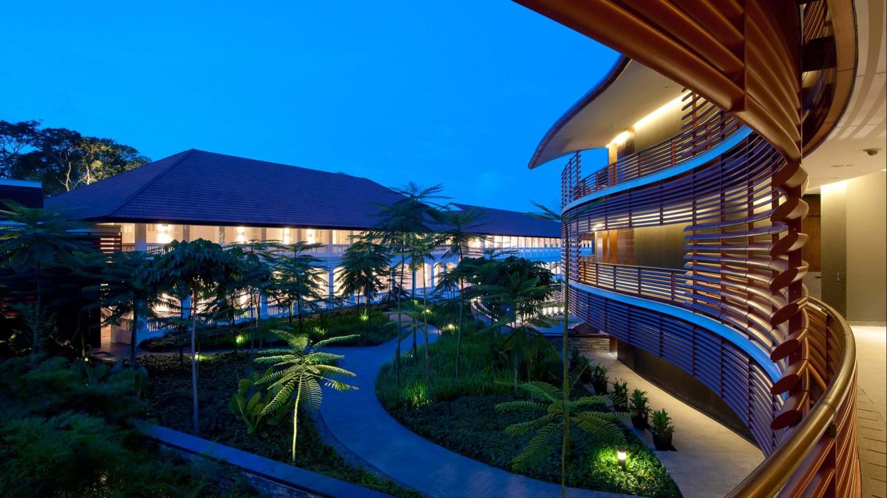 两座曾供英国皇家军官娱乐的历史建筑得到了精心修复,并主导了嘉佩乐的整体构成——福斯特在建筑两侧延伸出完整的环形平面,循着山坡的自然轮廓扩展出一座花园庭院,层叠的水池和错落的套房由此融合在30英亩繁茂的热带植物景观中。