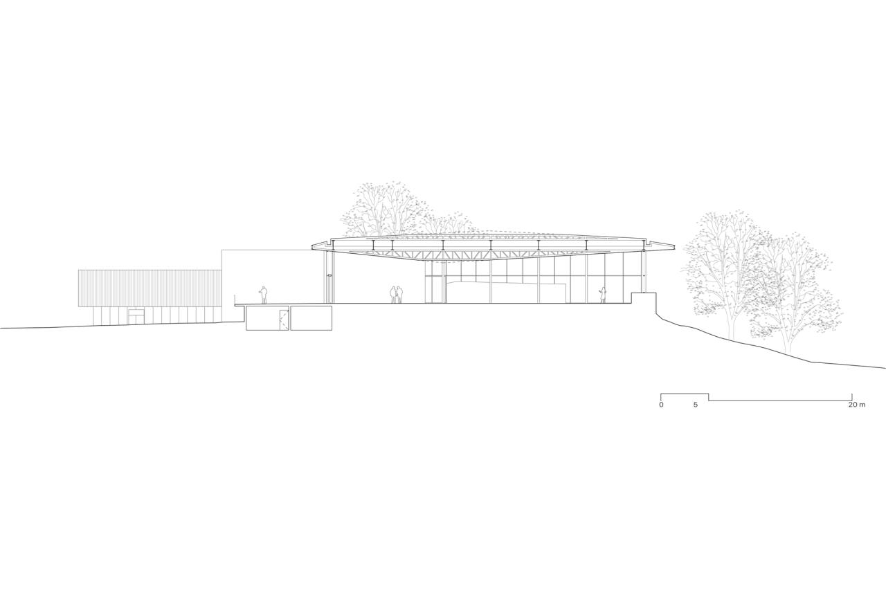 如此,一个无需支柱的宽阔空间就实现了,整个空间由五米高的玻璃幕墙围绕,在视觉上向行人、邻近的遗址和地理环境“开放 ”内部空间。此外,这些幕墙包含大型移动玻璃门,允许空间进行自然通风,减少了对空调的需求,并将大厅与遗址区不同楼层的庭院系统连接起来。