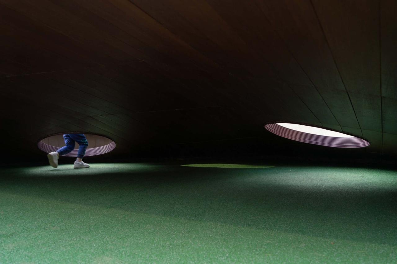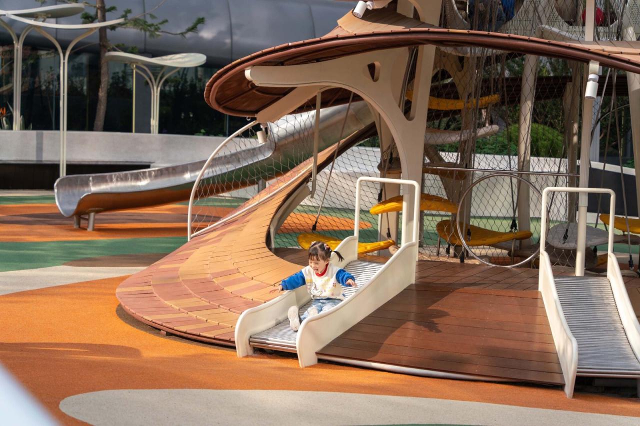 设计从自然起伏的洞穴地形出发,将丰富的儿童设施隐匿于大地与草木之间,过滤掉人造环境带来的冗杂信息,创造有庇护体验、自然归属感的儿童成长空间。成年人也可以在此感受到简单、放松与闲适,适合与家人孩子一起漫步游玩其间,共享天伦之乐。成都新希望天府·D10儿童活动空间,位于锦江区中心地段,靠近太古里繁华商业区。高层环绕的建筑环境,注定了该场地设计功能与艺术体验高要求的双重属性。