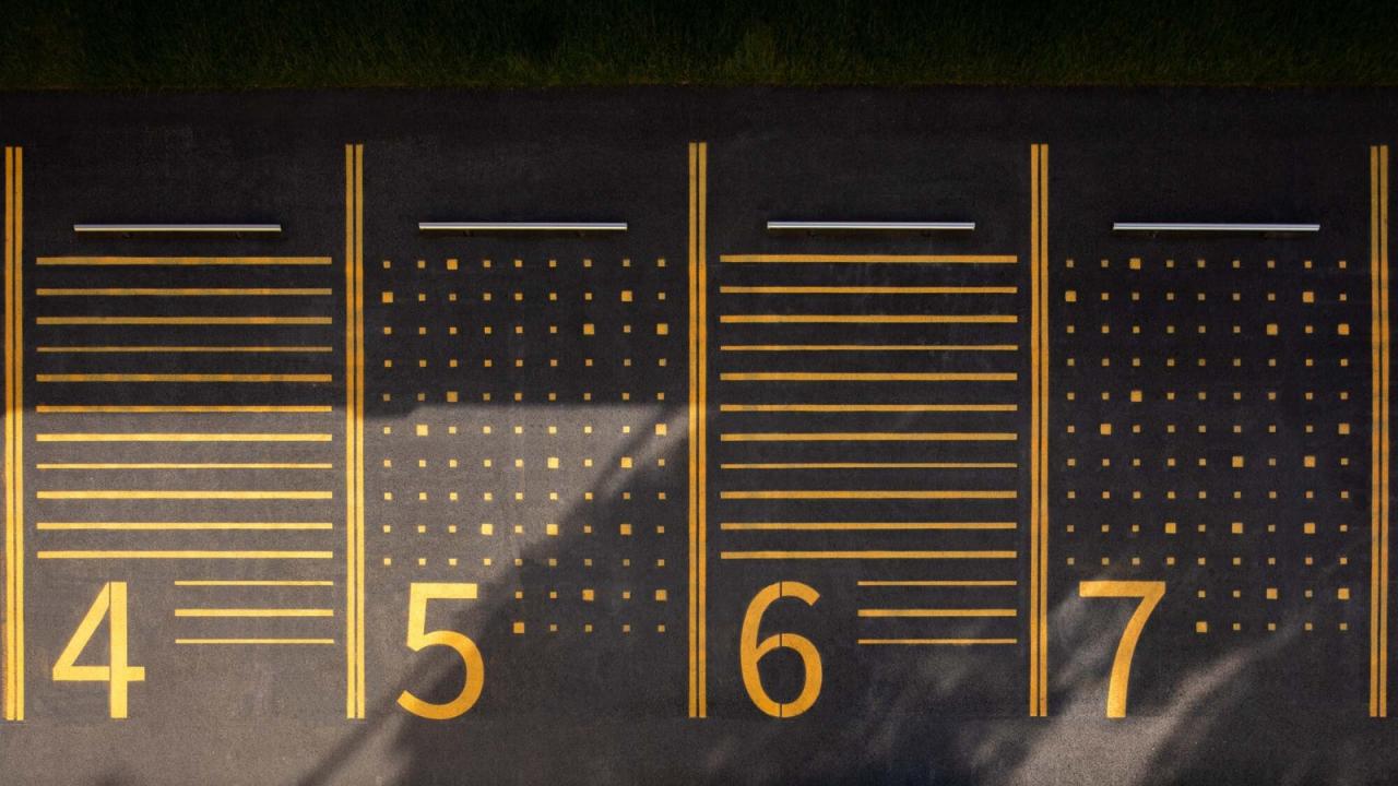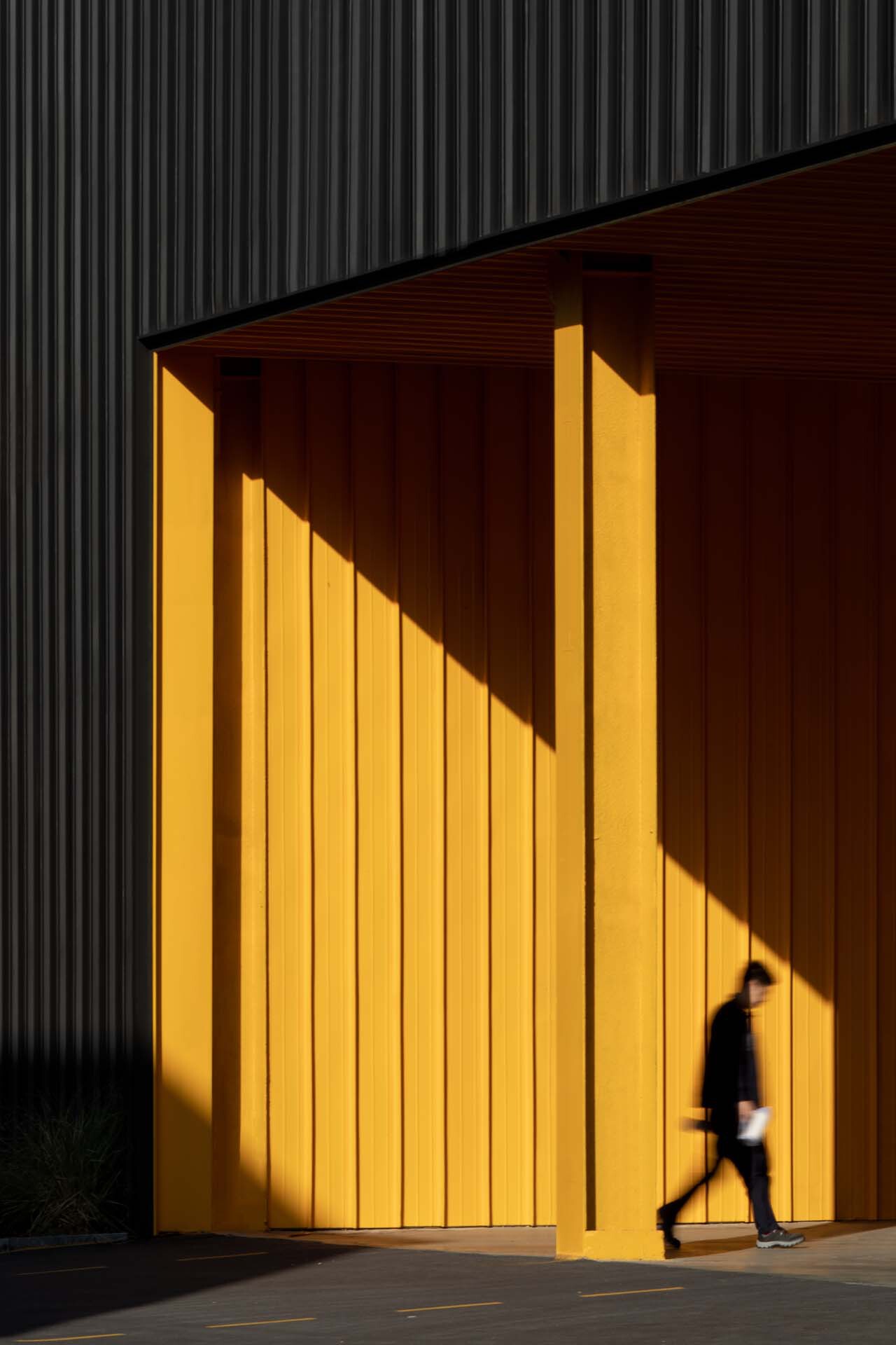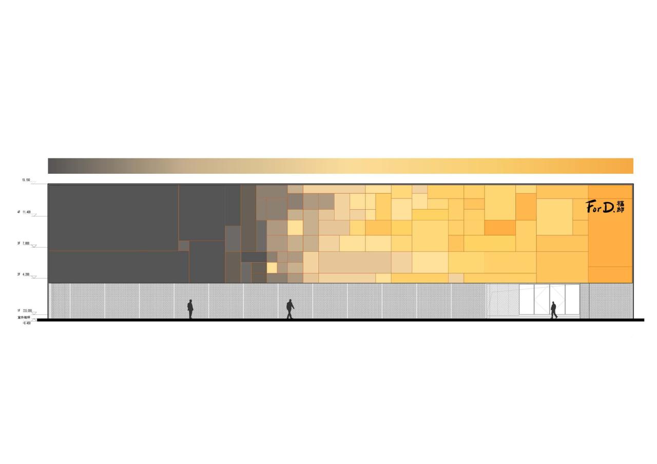 展厅建筑南立面,say尝试了参数化的构成方式丰富新立面网格体系,一抹福邸标志性的黄色从一端逐渐消隐至另一端,在规则中以不规则的网格排列前进,16个颜色在同一个立面上演绎着各自特有的色彩。园区的平面色彩也采用了建筑立面标志黄色与之呼应,厂区地面根据货物运输的车行流线和功能分区做了相应的指引,停车位区域的图案也结合到建筑立面的像素化概念。