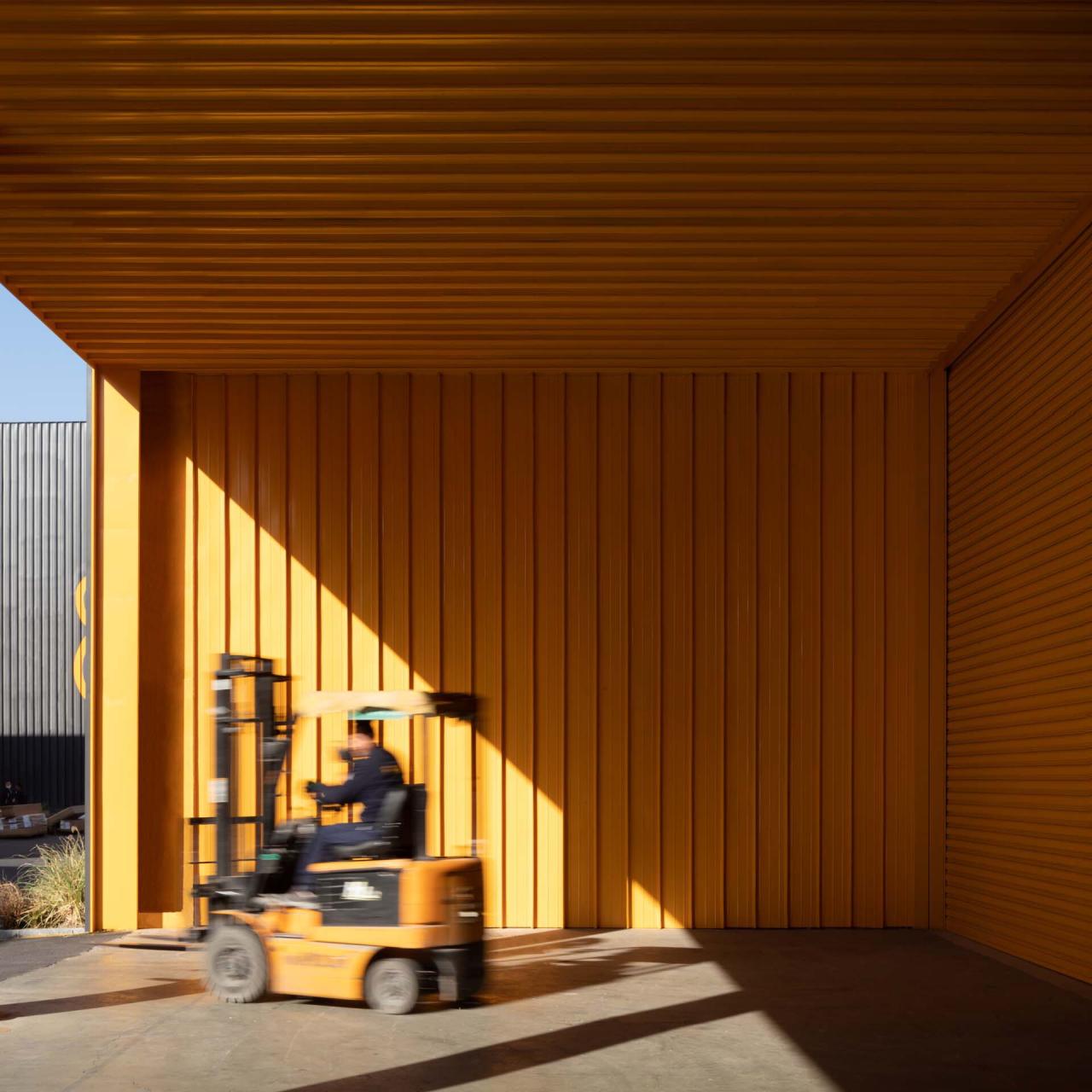 仓库遵循了原有建筑结构,根据立柱的位置考虑到搬运货物的尺度,把每一跨柱作为一个货架的区域,并以号码标注,黄色与黑色的对比使人能快速的识别到货架编号,便于分区管理。