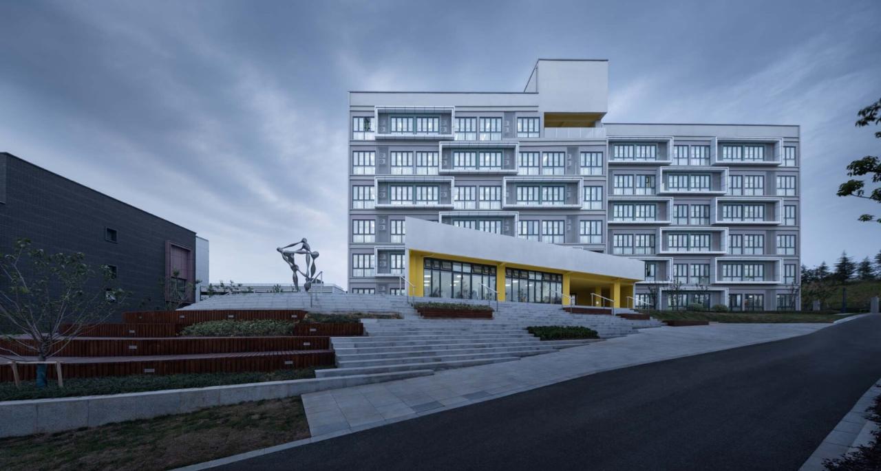 西区:教学楼位于西校区的西北角,按照年级分为三栋平行排布于一侧,每栋容纳20间普通教室。三栋楼以共享长廊相连,教师办公室靠长廊设置在各层,方便师生平时交流。行政楼位于西区中轴线,与塔楼遥相呼应,统领学校。其外立面采用干挂灰砖幕墙,呼应了老校区建筑风格。食堂体育馆,其建筑体量一二层为食堂,可容纳约两千名师生同时就餐,三层为风雨操场、艺术训练馆,馆内置入跑道,开设天窗满足室内采光需求。亮点:STREAM学习中心作为校园的“核心精神堡垒”,位于西区主入口。