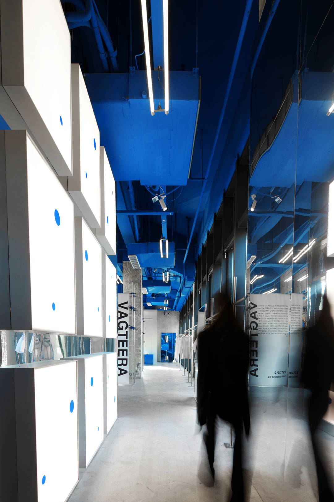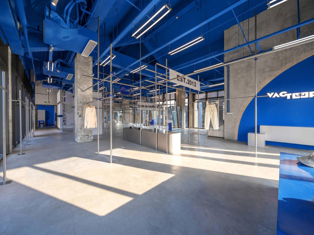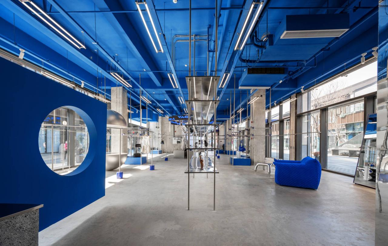 Vagteera通过使用可拆装二次利用的定制脚手架,打造出可根据季节展示需求灵活布置的购物分区,创造出更有韵律的空间动线。在立面上舍弃粉刷面层以露出水泥的裸墙、加入蓝色矿石粉末调和的水泥自流平、随处漂浮的不锈钢蓝色小球等细节,形成了有趣的层次感,凸显冰川漂浮的视觉感受。我们希望这种视觉上的矛盾与冲突,这样的 “野性主义”能够让消费者在环保理念上达成一定的共鸣。