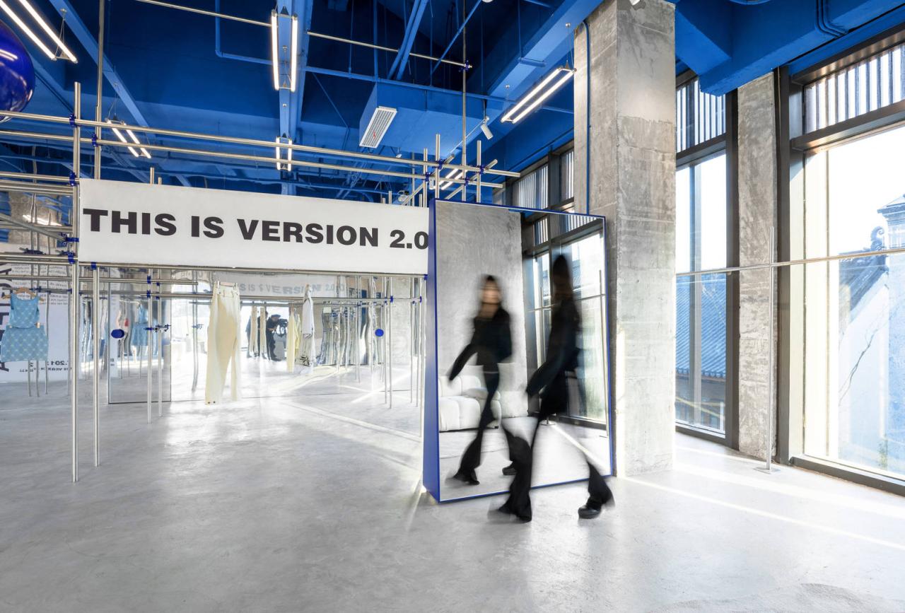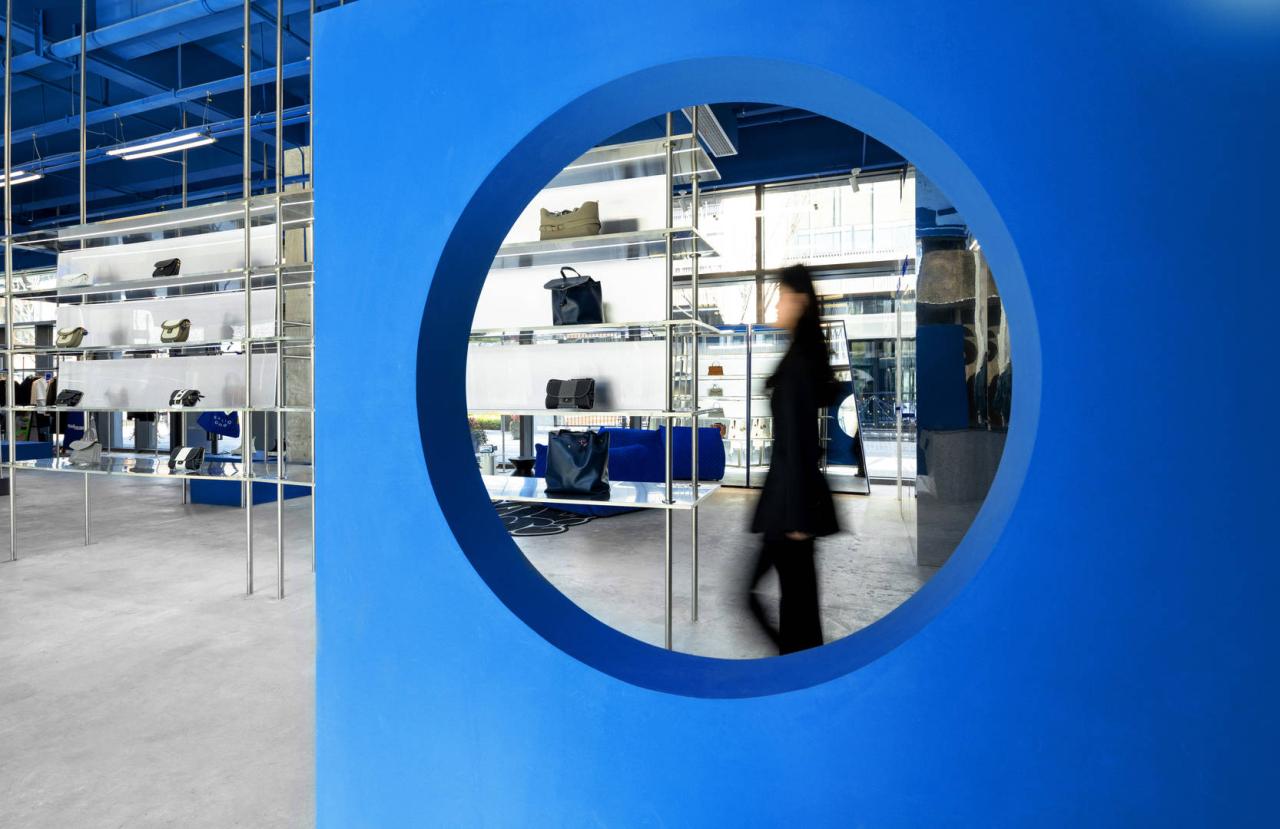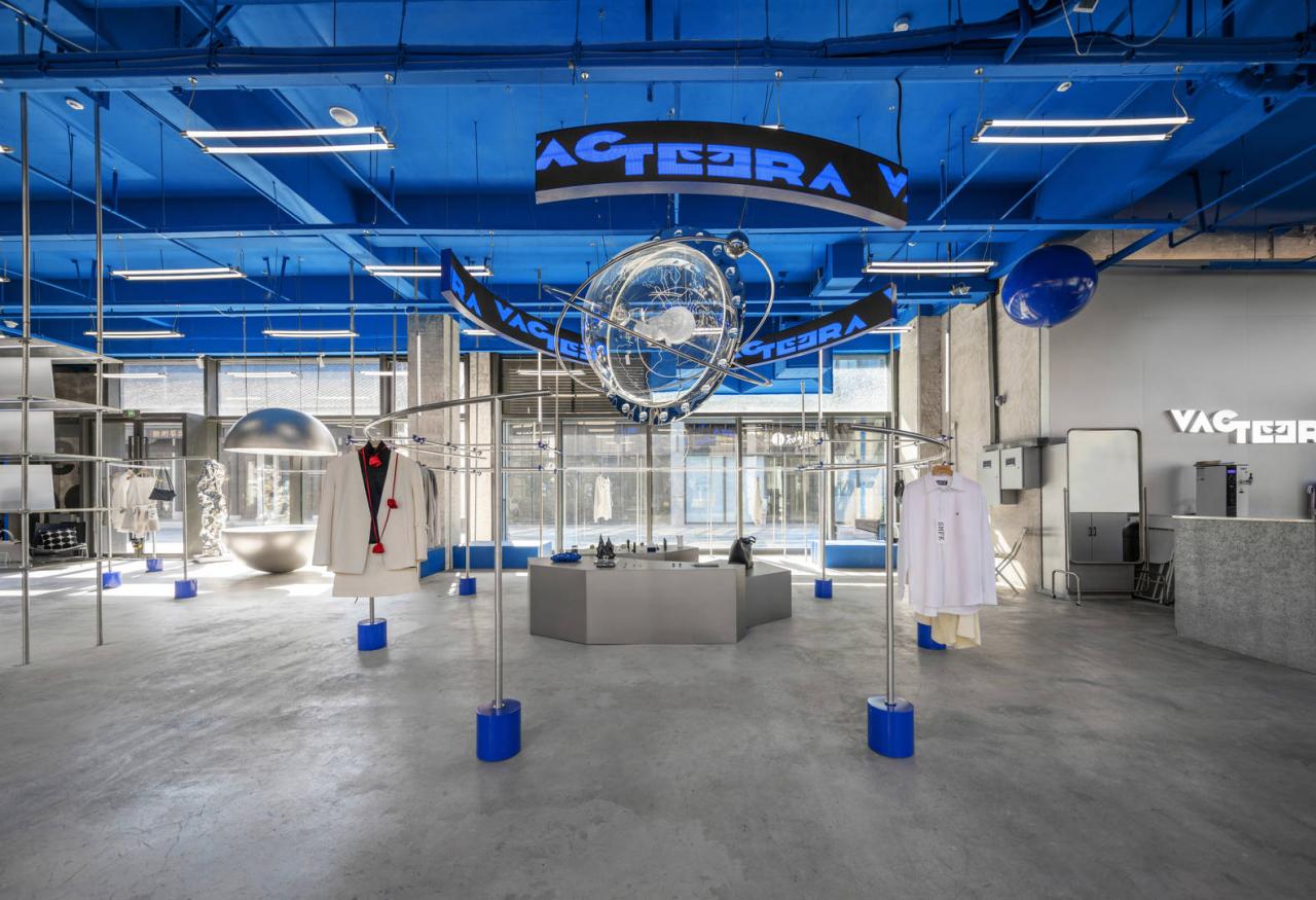 Vagteera通过使用可拆装二次利用的定制脚手架,打造出可根据季节展示需求灵活布置的购物分区,创造出更有韵律的空间动线。在立面上舍弃粉刷面层以露出水泥的裸墙、加入蓝色矿石粉末调和的水泥自流平、随处漂浮的不锈钢蓝色小球等细节,形成了有趣的层次感,凸显冰川漂浮的视觉感受。我们希望这种视觉上的矛盾与冲突,这样的 “野性主义”能够让消费者在环保理念上达成一定的共鸣。