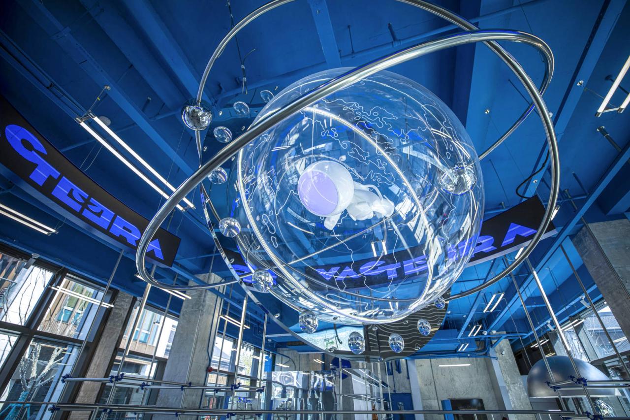入口处置入悬浮的地球艺术装置,巧妙地运用了不锈钢轨道和亚克力球的反差效果,并搭配呼吸灯装饰的太空人形象,呈现出极具视觉震撼的中心形态,引发了消费者的好奇心。这个设计不仅突显了未来感十足的空间氛围,同时也为店内营造出了强烈的艺术气息。