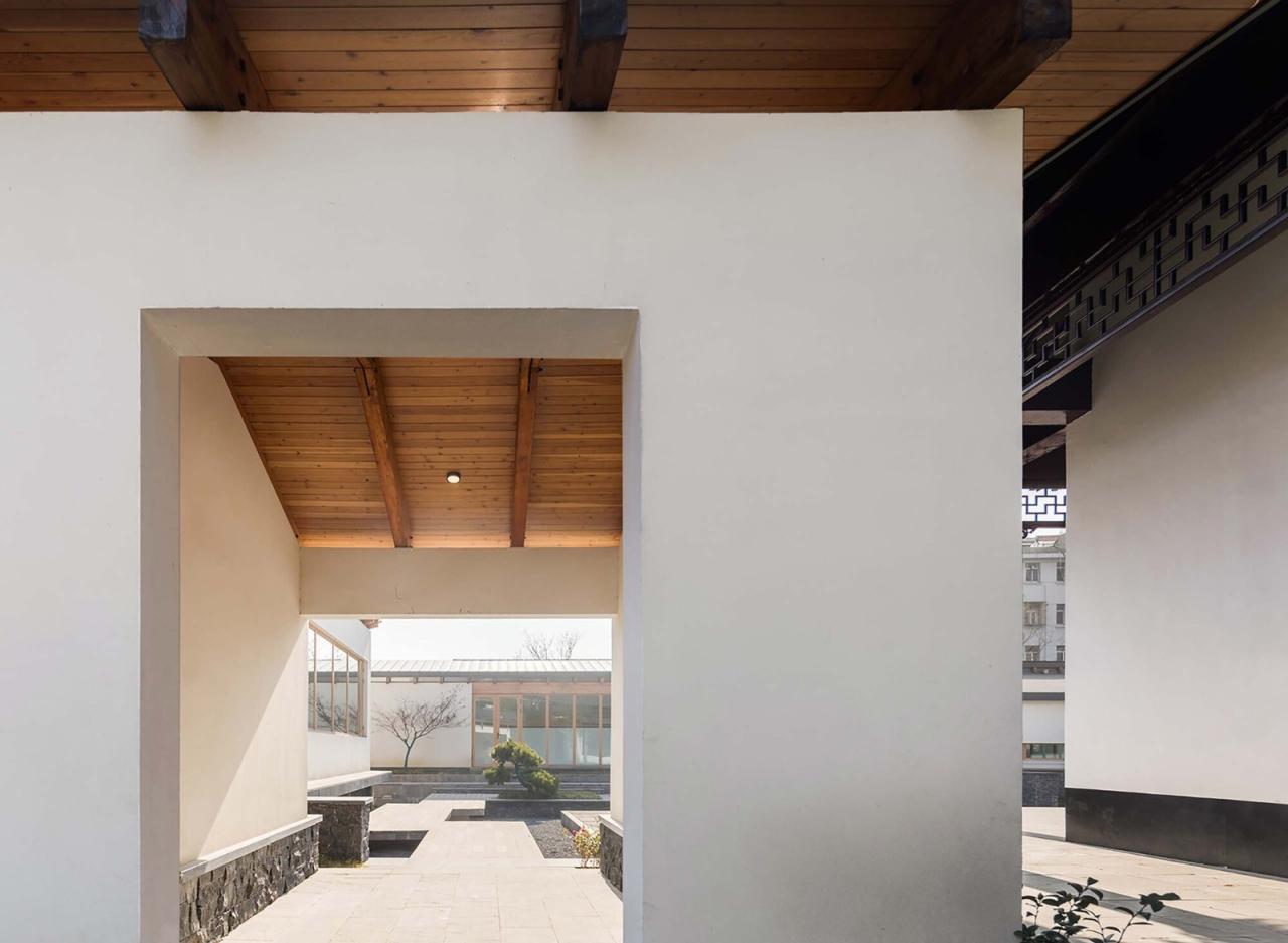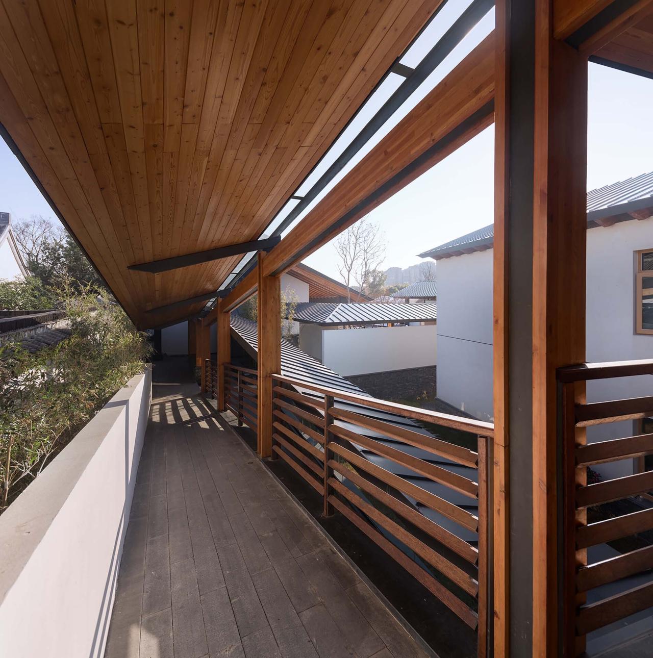 院 – 书院 对合院空间的重构书院位于竹西公园南端,我们试图从人的活动场景出发,对传统合院形制进行现代转译,以此回应建筑多样的使用场景与空间环境的共生关系。类似《韩熙载夜宴图》中起到界定与规置各种人群活动的屏风,企图引发各种行为互动,诗情画意萌发的多重场景体验。廊子不再仅仅用作穿行,更如屏风在这幅长卷中起到转换场景的功能。