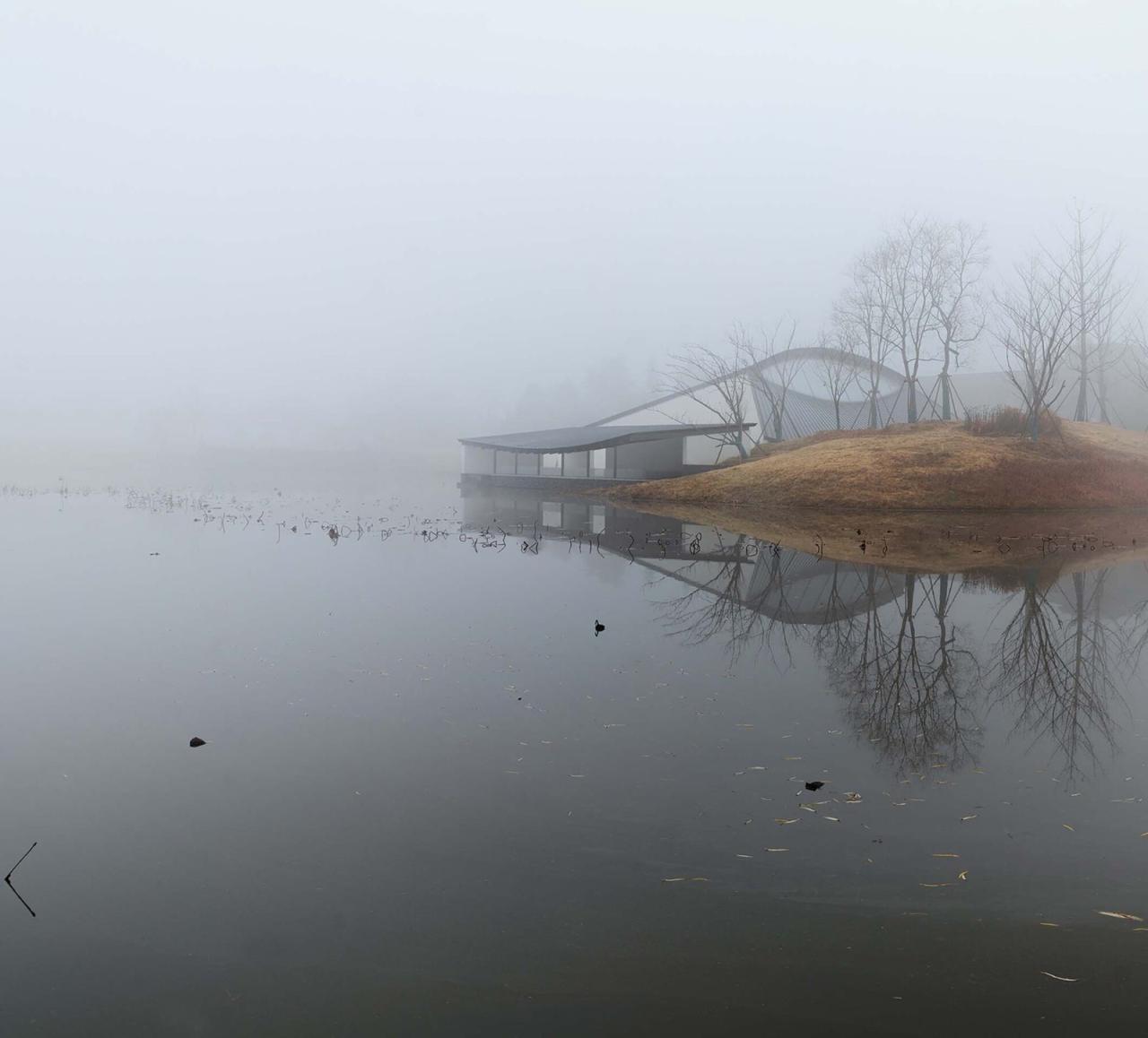 舍 – 茶室 对房舍原型的重构茶舍位于公园东湖的湖心岛北坡,临水而建,环境氛围开阔而静谧。茶舍重构了一个单独“房舍”原型,重新思考了建筑中人与自然的关系,营造独特的空间氛围。茶室内部通过一面隔墙并置了南北两个氛围不同的空间。北面观水,压低的屋檐屏蔽了城市远景的喧闹;南面观山,坡上种植高大落叶乔木;屋脊设有楔形天窗,尽可能地沿太阳轨迹射入,感受时间的变化。四时变化、季节冷暖,环境的变化皆被纳入其中,是对建筑与自然与人的关系的再思考。