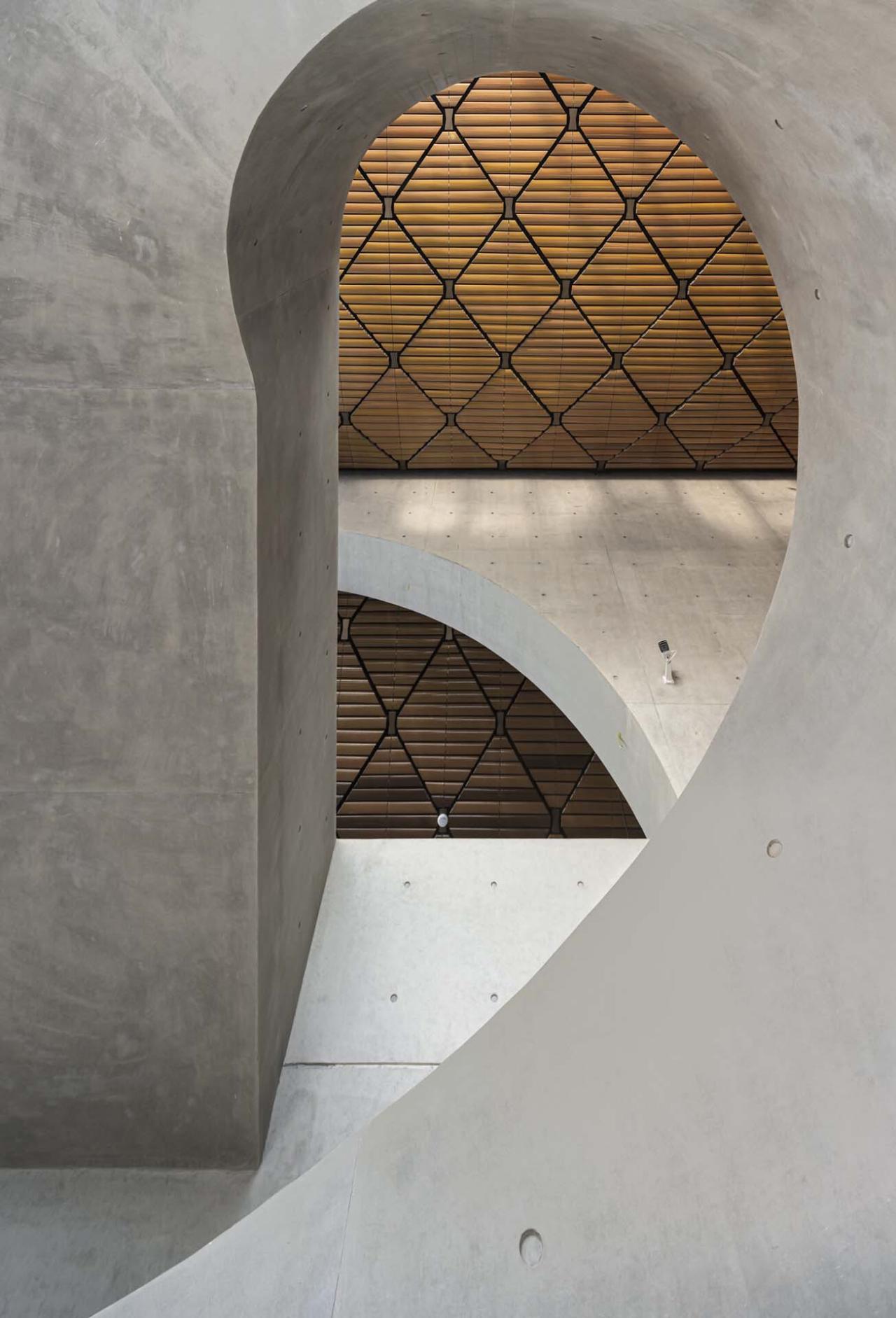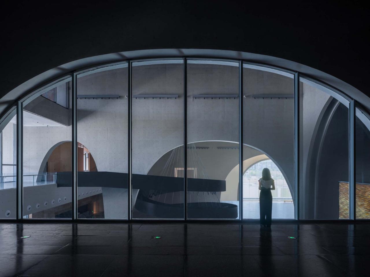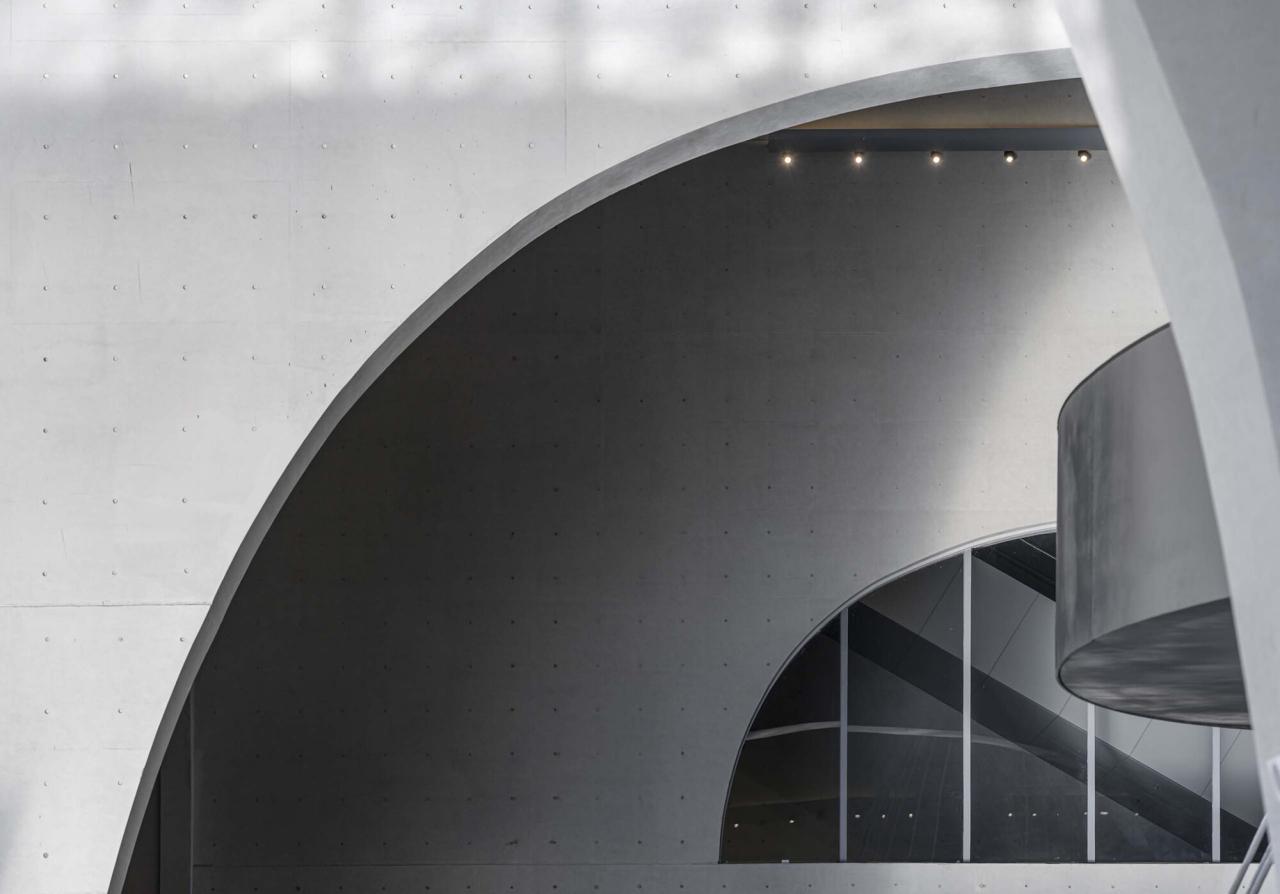 结构的对偶运用,在平面组织上采用横向与纵向交织的拱形剪力墙形成有效的双向抗震结构体系,在剖面组织上上部屋面采用预应力混凝土悬垂板+端部混凝土“唐瓦当”与下部基座的拱形剪力墙共同组成闭合的剪力墙传力体系。平面对偶的结构特征通过大模板的清水混凝土浇筑形成清晰的室内空间架构,而剖面对偶的结构关系则通过陶瓷和青砖的材料组合赋予特定的历史记忆和文化内涵。