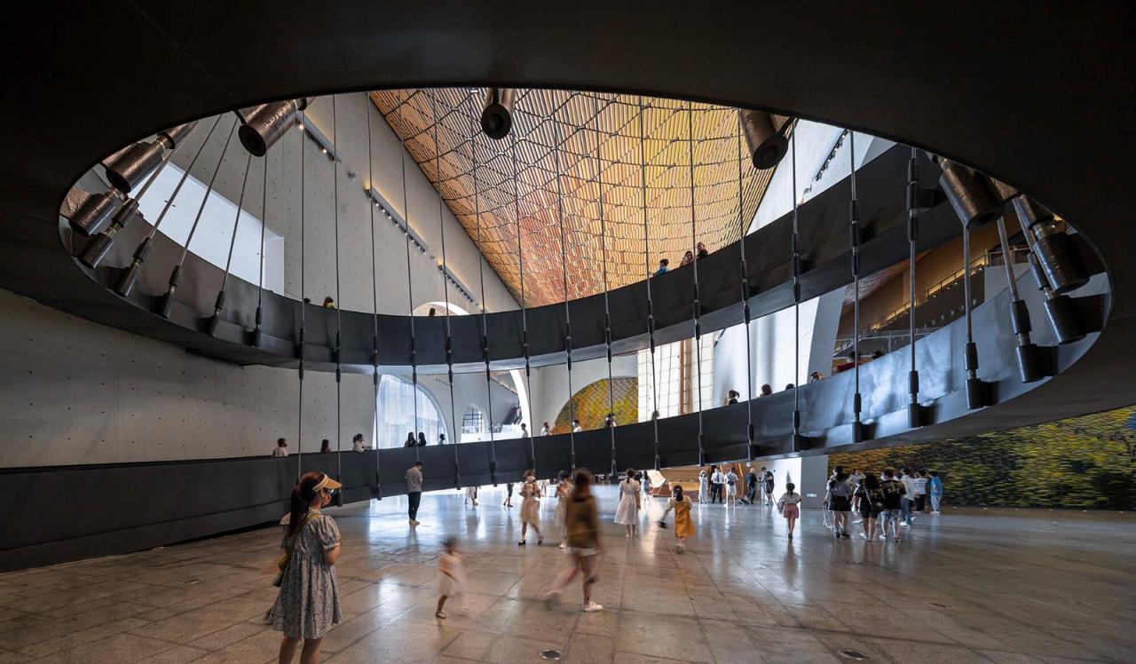 建筑主材的选用强调在地性的原则,即“洛阳造”。室内外大量采用改良后的洛阳三彩陶瓷挂板饰面,较好地缓解了清水混凝土建筑易给人带来的疏离感以及内部空间声学方面的缺陷,其中的吊顶《云帆》由126986个三彩陶瓷单元组成了迄今世界最大的陶瓷吊顶艺术作品。我们在设计过程中与洛阳当地的工艺美术家郭爱和、高水旺反复讨论试样,把传统手工陶艺与现代设计、加工技艺相结合,助推洛阳传统陶瓷产业的创新发展。