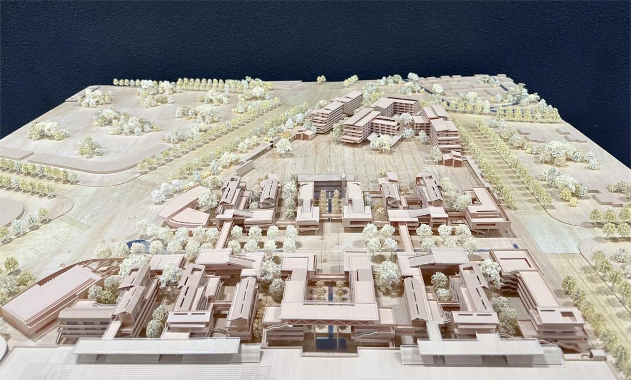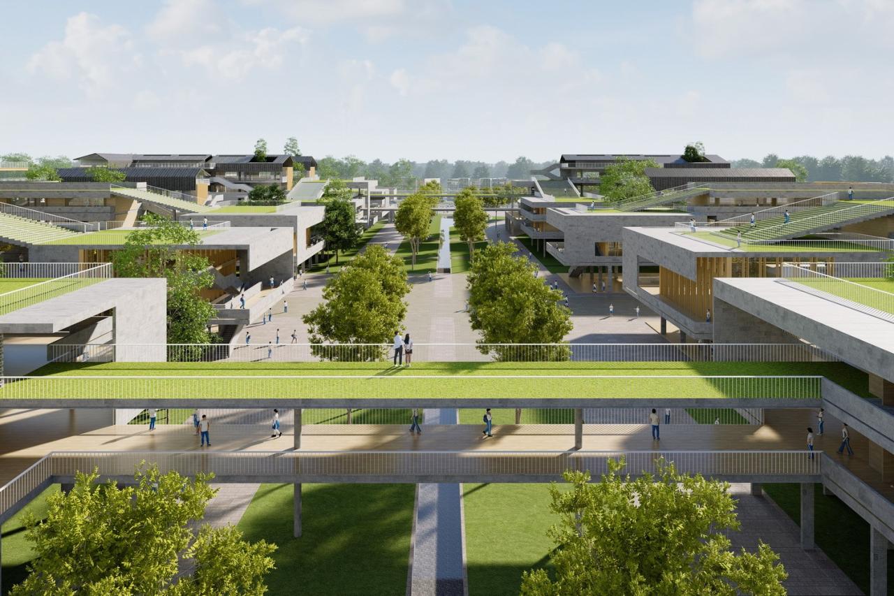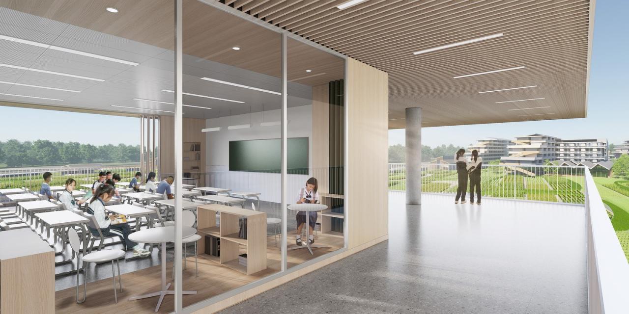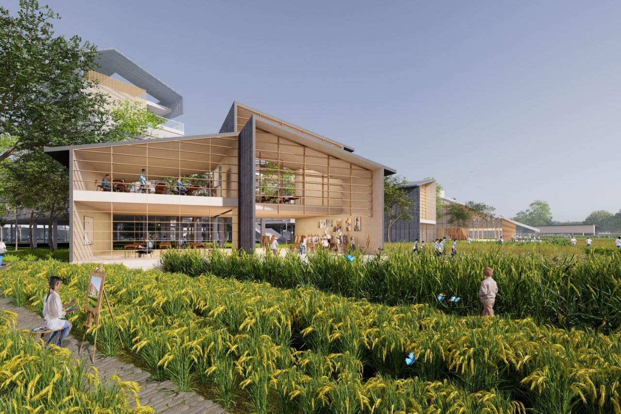 AG汇创从湾区教育类建筑设计及落地经验出发,以适应未来教育为起点,引入国际先进办学理念,充分融入岭南在地文化与周边生态记忆,以“现代阡陌书院”定义整个项目的设计。以研究性为前提,通过联结历史脉络、环境记忆、建筑构成,创造田塘村与新城市相应对,与文化脉络相传承的岭南现代校园。