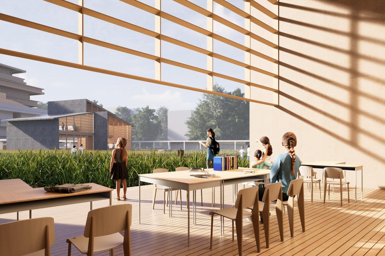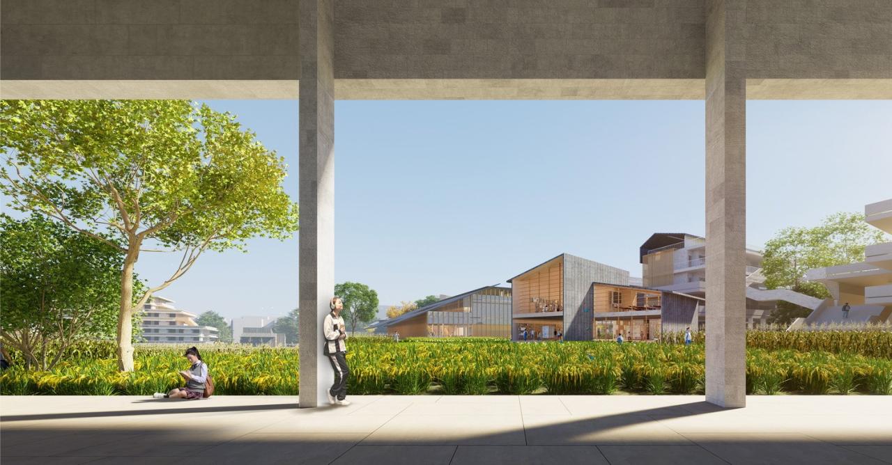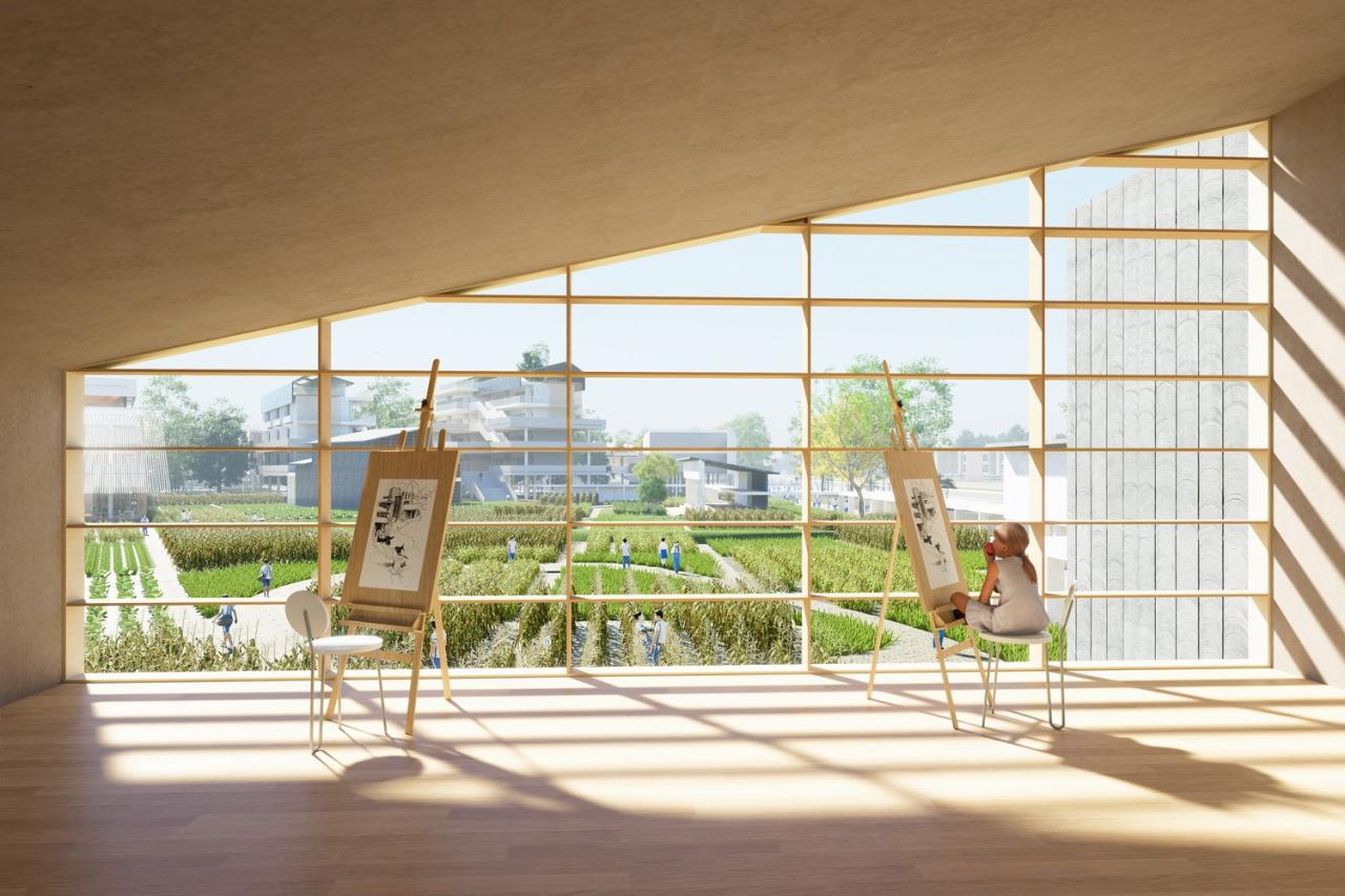 ”耕“让学生回归生活与生产劳动。稻田、桑葚、作物和当地野草构成新的校园生态环境,生活与自然的无缝对接,让师生感知四季变化,同时灵活式规划也为未来发展,预留更多用地的可能性。