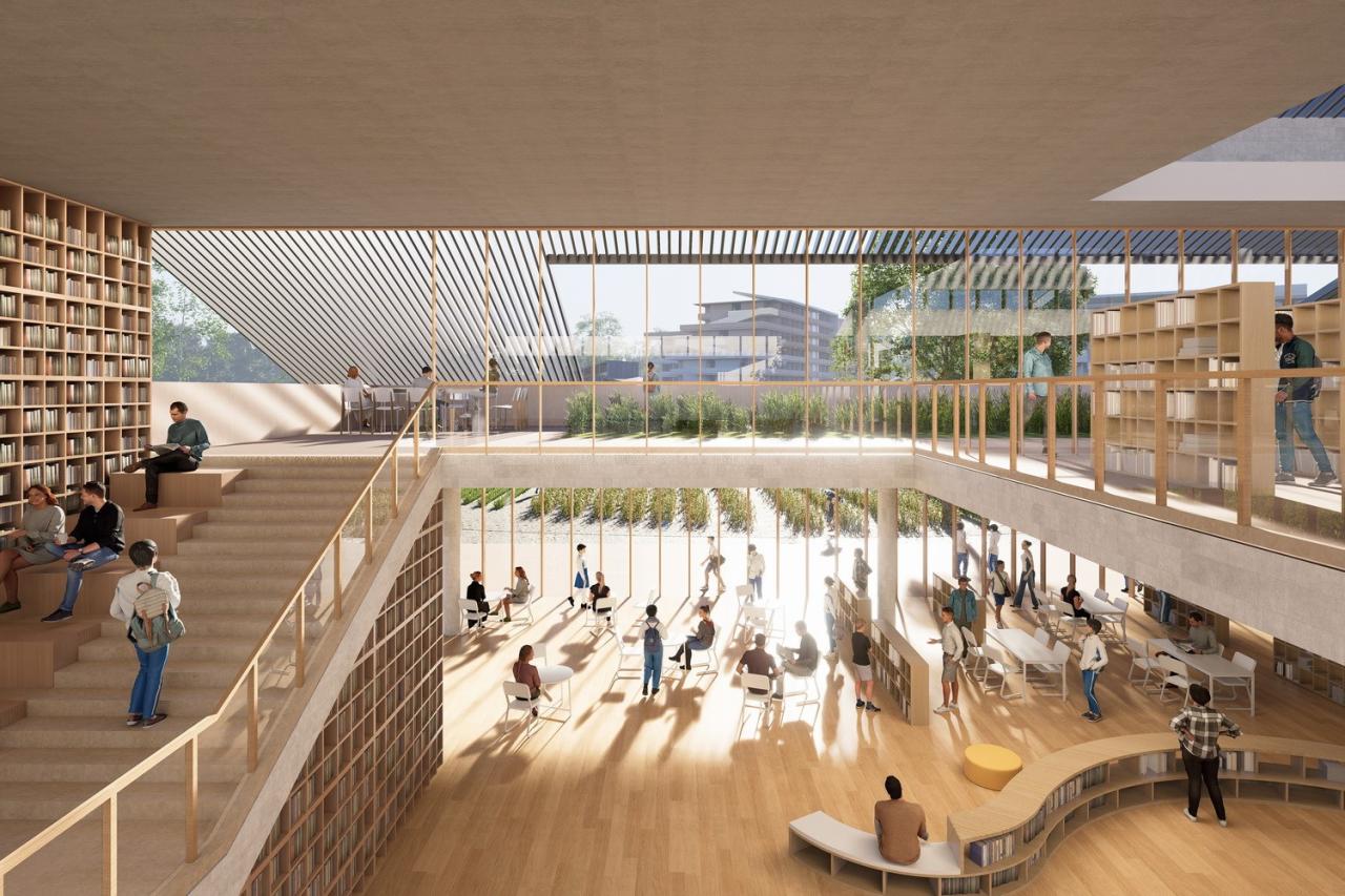 △如自然书卷般的交流与学习环境,通过体块错动与围合创造宜人的书院 ©AG汇创