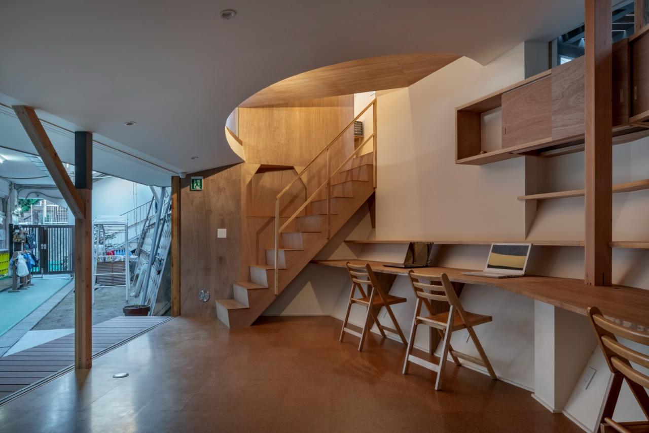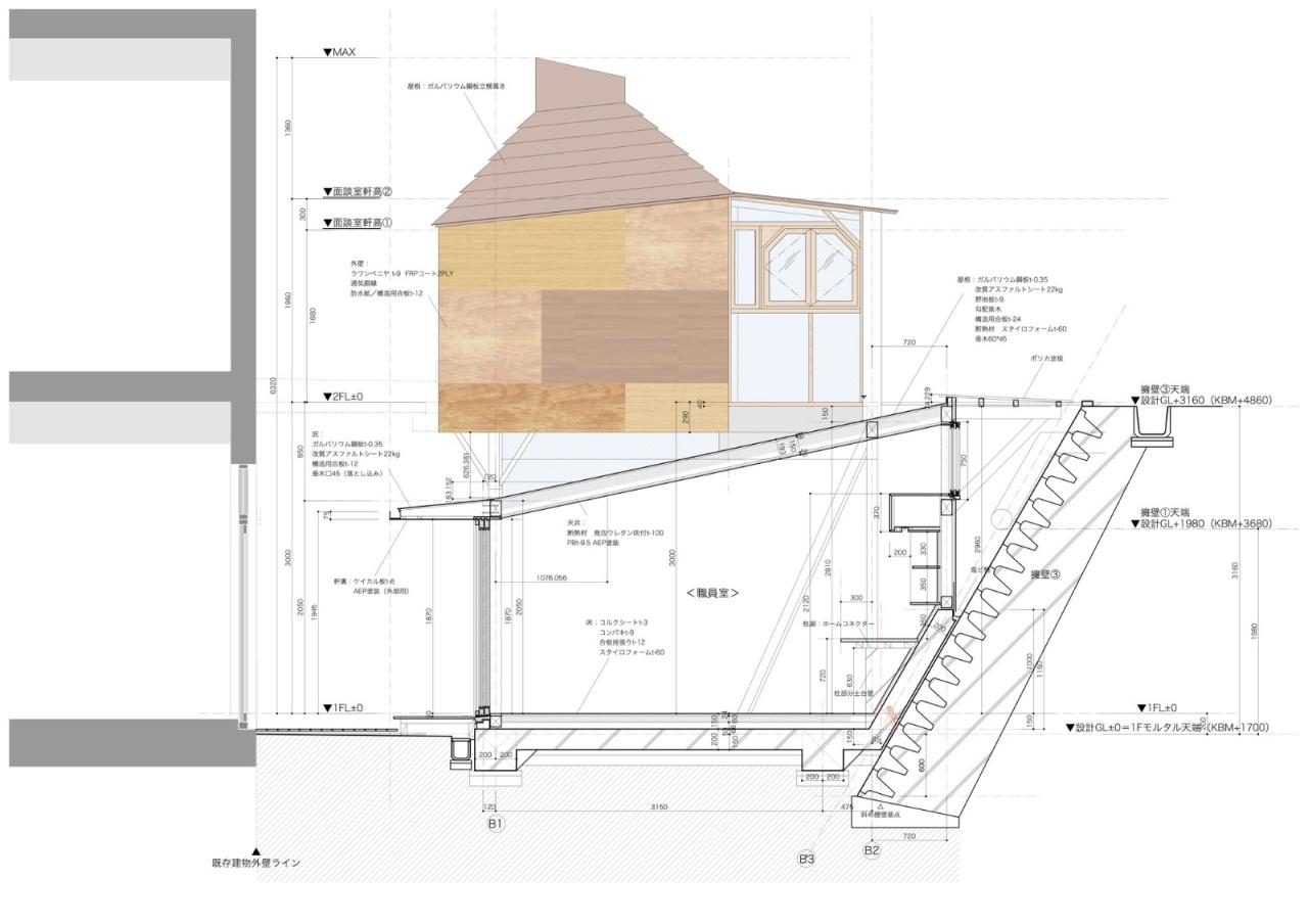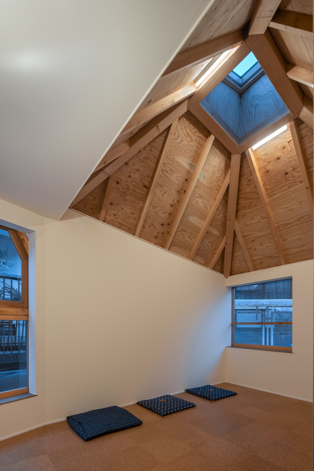 与场所相对的微架构-项目是名古屋市山里保育园的增筑栋。现有建筑为两层钢筋混凝土结构,位于斜坡北侧与道路的交界处。业主希望营造一个为教职工所服务的办公和多用途小空间。