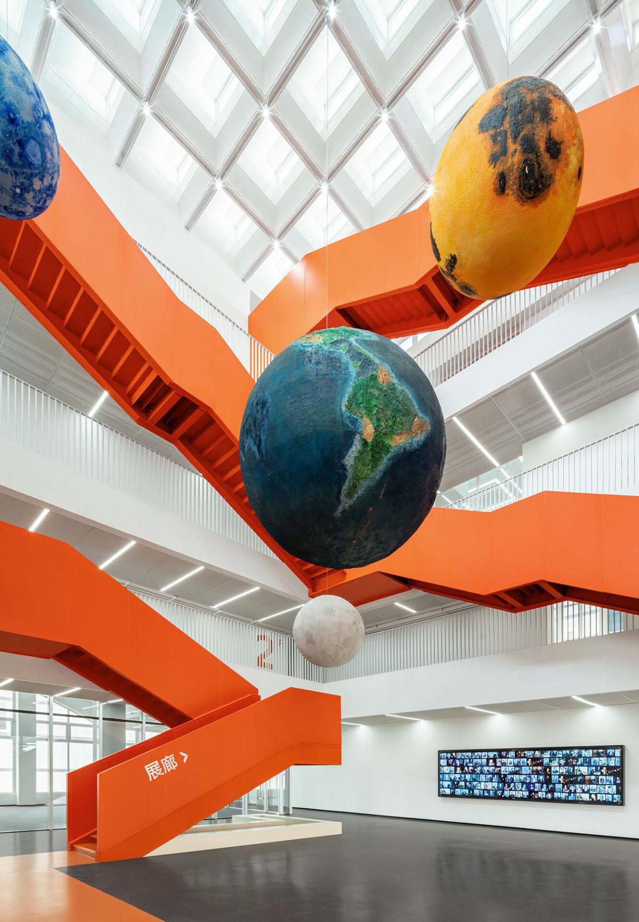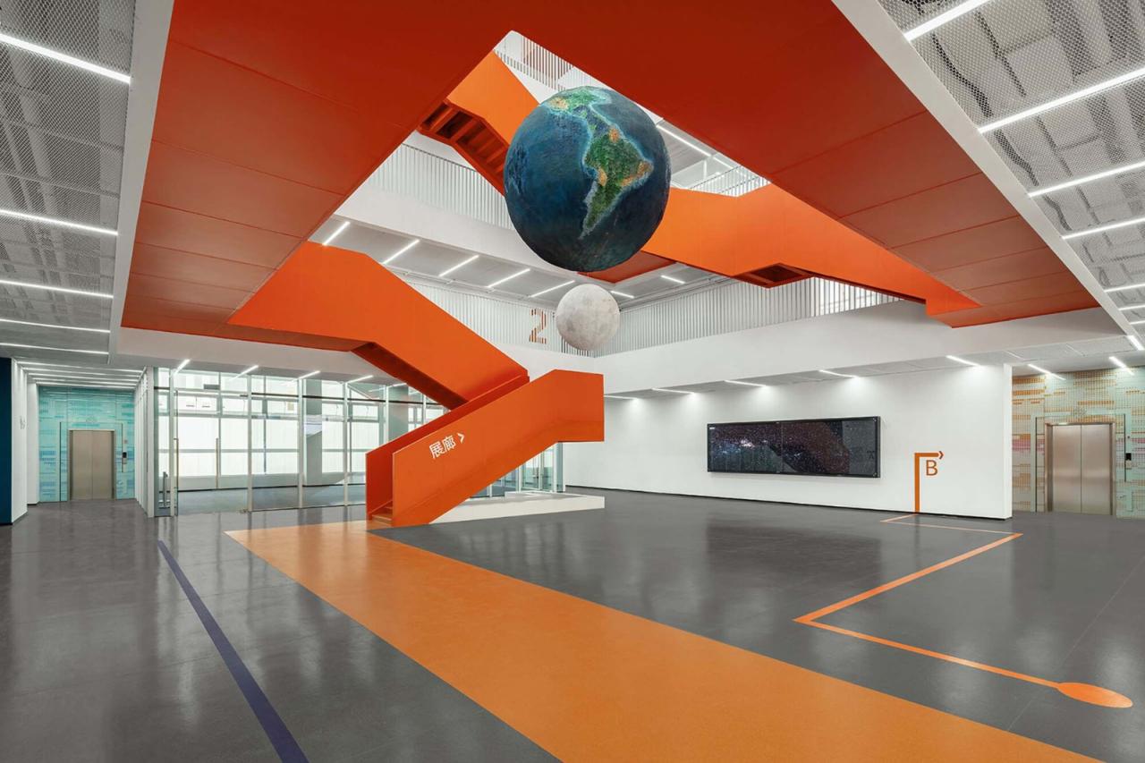 双轨路径,立体流线常规展览流线主要是平面线性的,而面对本项目小规模的前提,平面流线会被楼层所打断,削弱参观连续性。设计将流线设置为立体多维,并处理为两个参观序列。参观者从首层两个不同的入口开始参观,沿着各自流线参观完毕之后再通过垂直交通到达对方流线的起始,进而完成完整的科普观摩。类似空间双螺旋结构的流线设计可实现两股人流同时参观又互不干扰,提升参观效率。