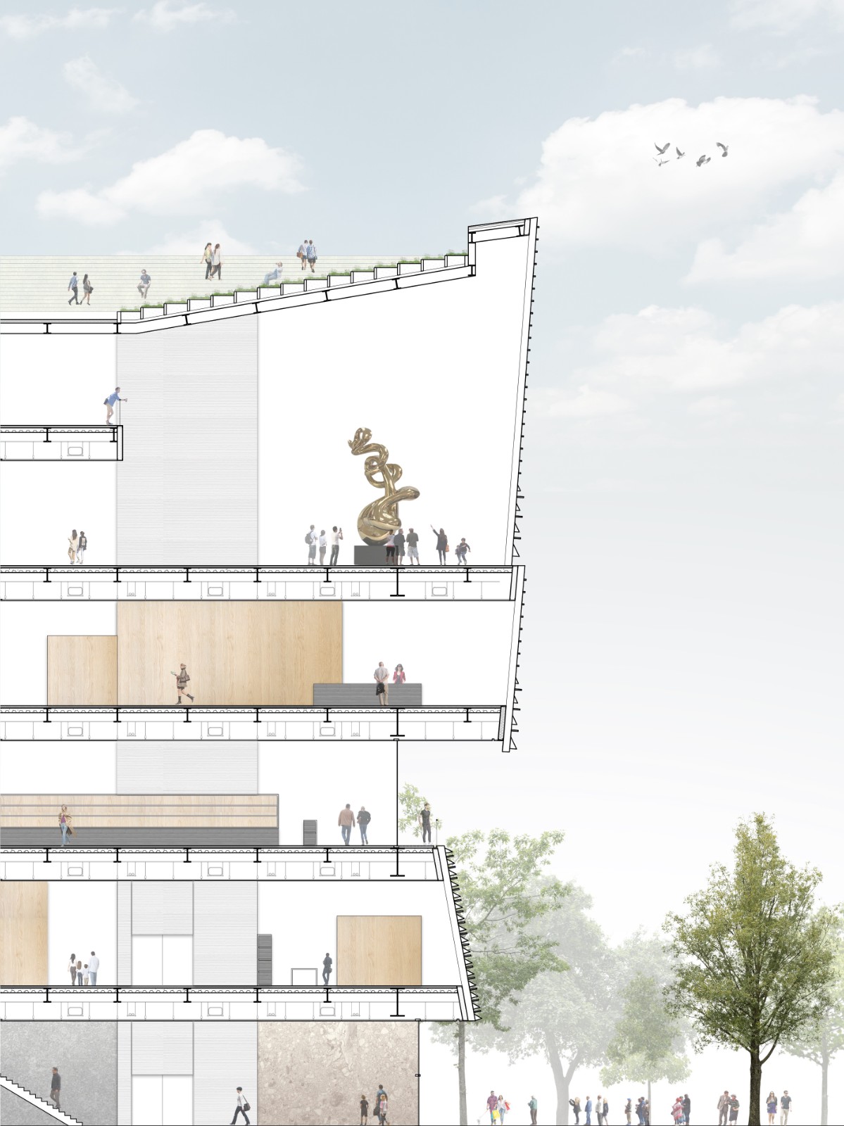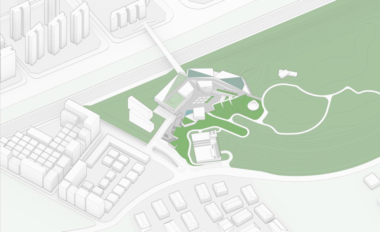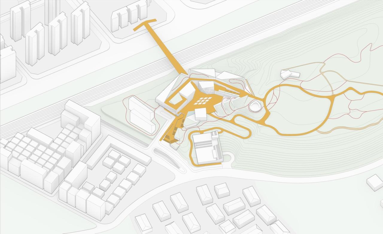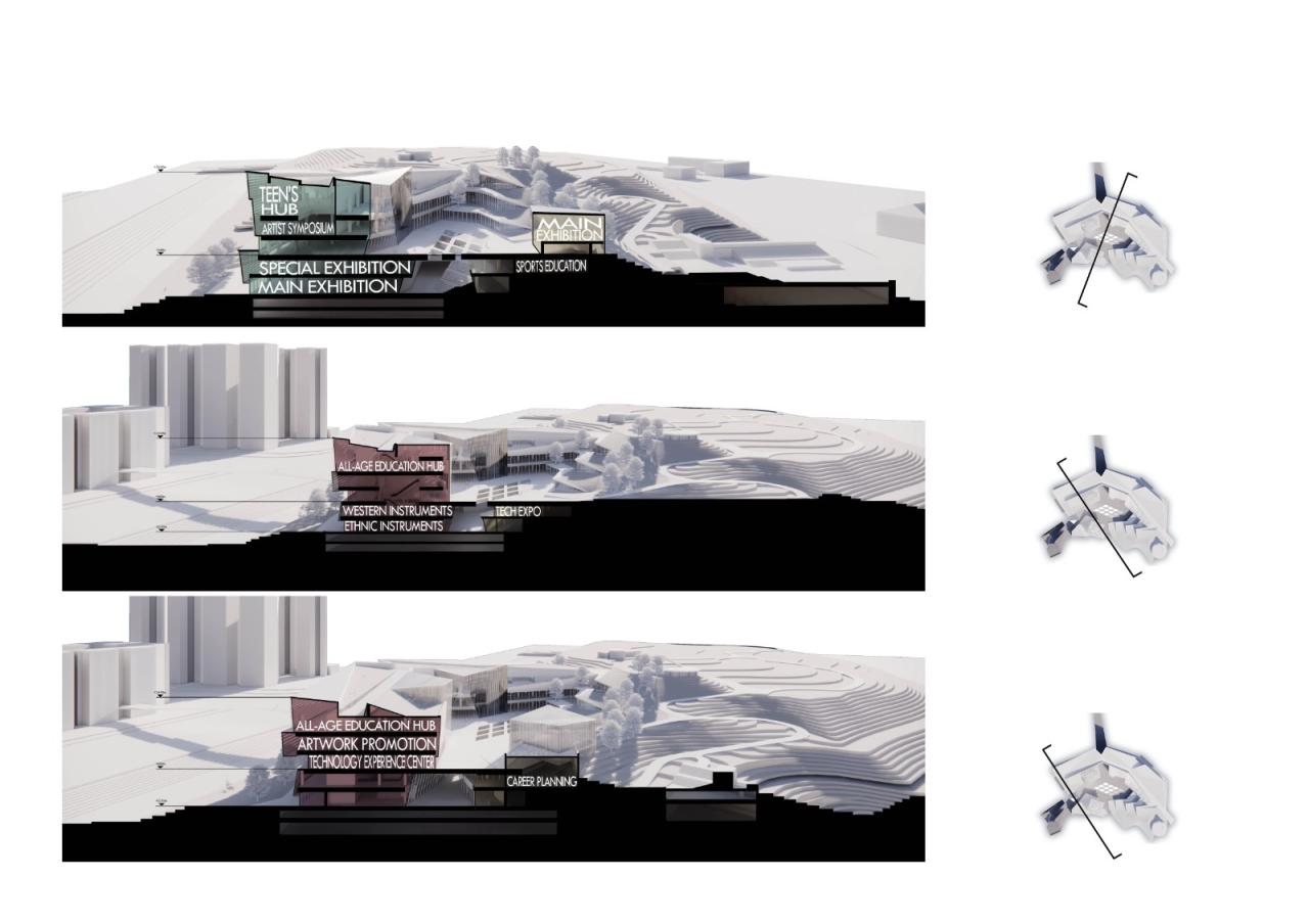 基于对共存和共享的生活品质的定义,建筑使用和设计方式遵循“社区理念”和“多样性”。两心一馆,共三个建筑,三个文化功能既分可合,立体平台和垂直关系连接城市与公园,促进互动,实现全龄化参与,一如共生共长的“多维文化艺术山丘”。