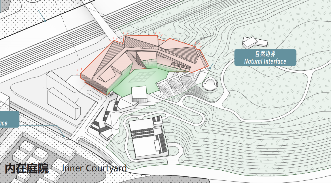 延续文脉地景,通过建立与地形的联系,修复现有基地与城市和自然割裂形态,借助生态修复打通山海通廊,与空间的融合构建沉浸式的观览体验。设计遵从的是自然与建筑艺术的结合。