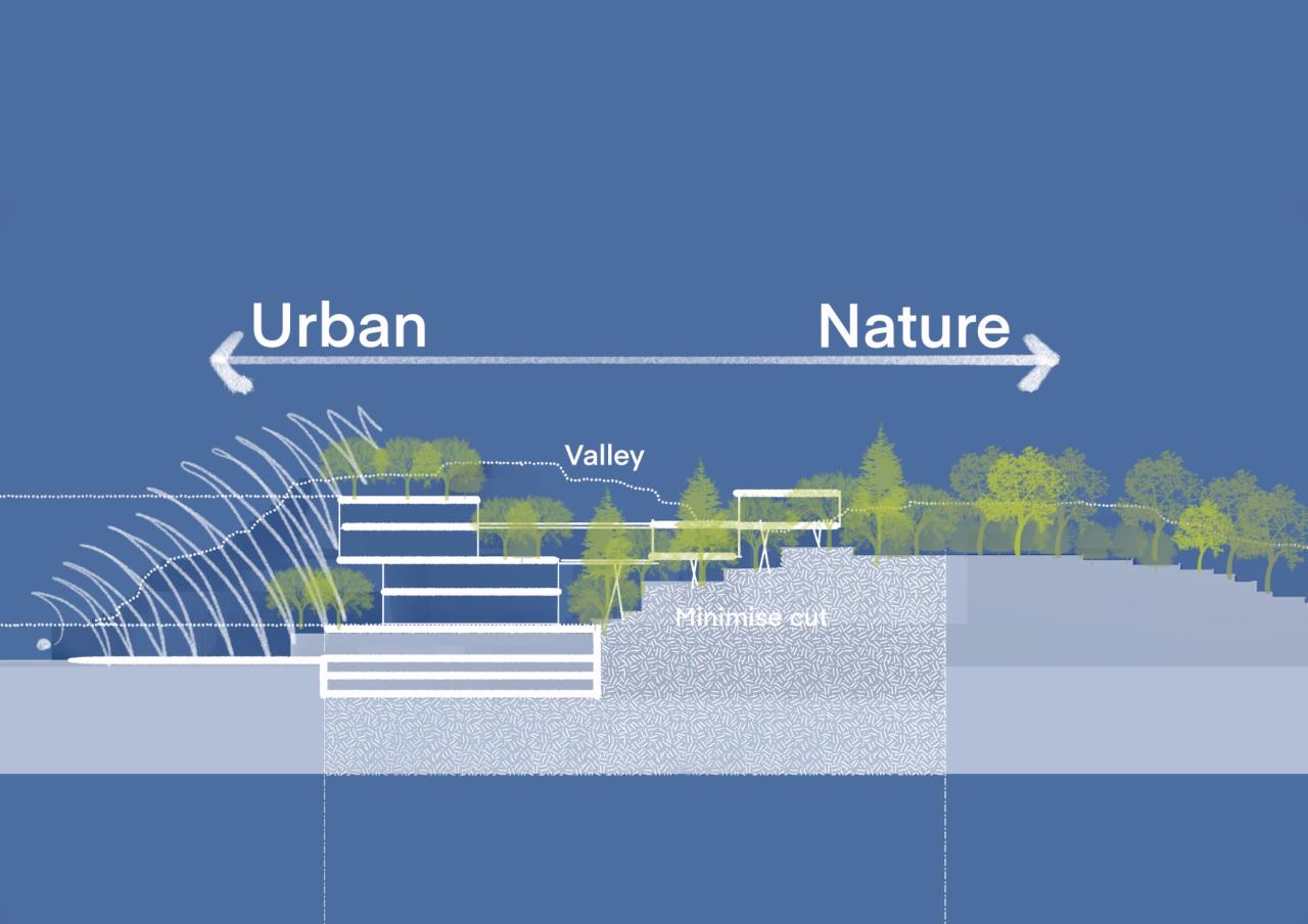 场地位处城市边界,紧邻白石龙音乐公园,串联组成了自然生态的城市绿环,可尽览塘朗山与梅林山开阔景观。我们将高品质设计工作前置,在设计策略上强调聚构文化高地为目标,从城市维度表现为一个“缝合的边界”,双面回应城市与自然。