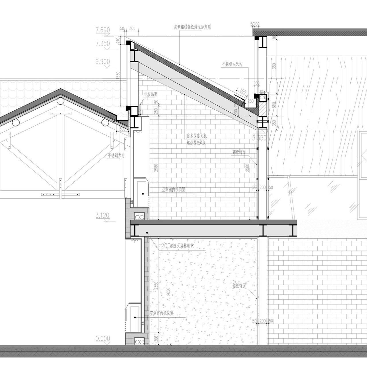 低碳建造,材料循环利用遵循低碳建造的理念,设计尽可能保留原有建筑的材料。将建造中临时拆除的部分屋架、望板、老砖进行循环利用,保留原有材料在建筑使用中形成独特的纹路。