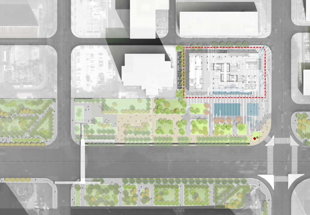 平面规划在首层实行人车分流策略,场地西北侧为车行区域,东南侧向城市开放。