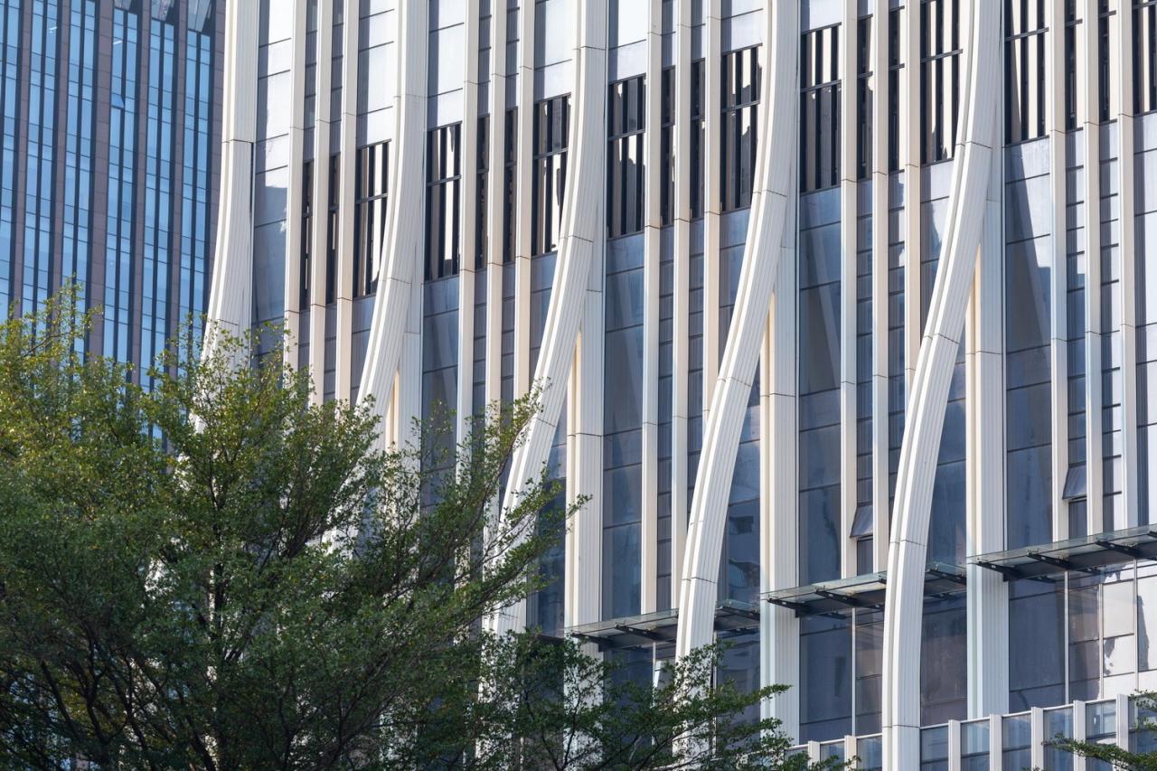 塔楼从顶部到底部体量慢慢增大,弧线渐渐展开,如蜿蜒的“溪流”,顺滑往前,一泻而下,一气呵成。