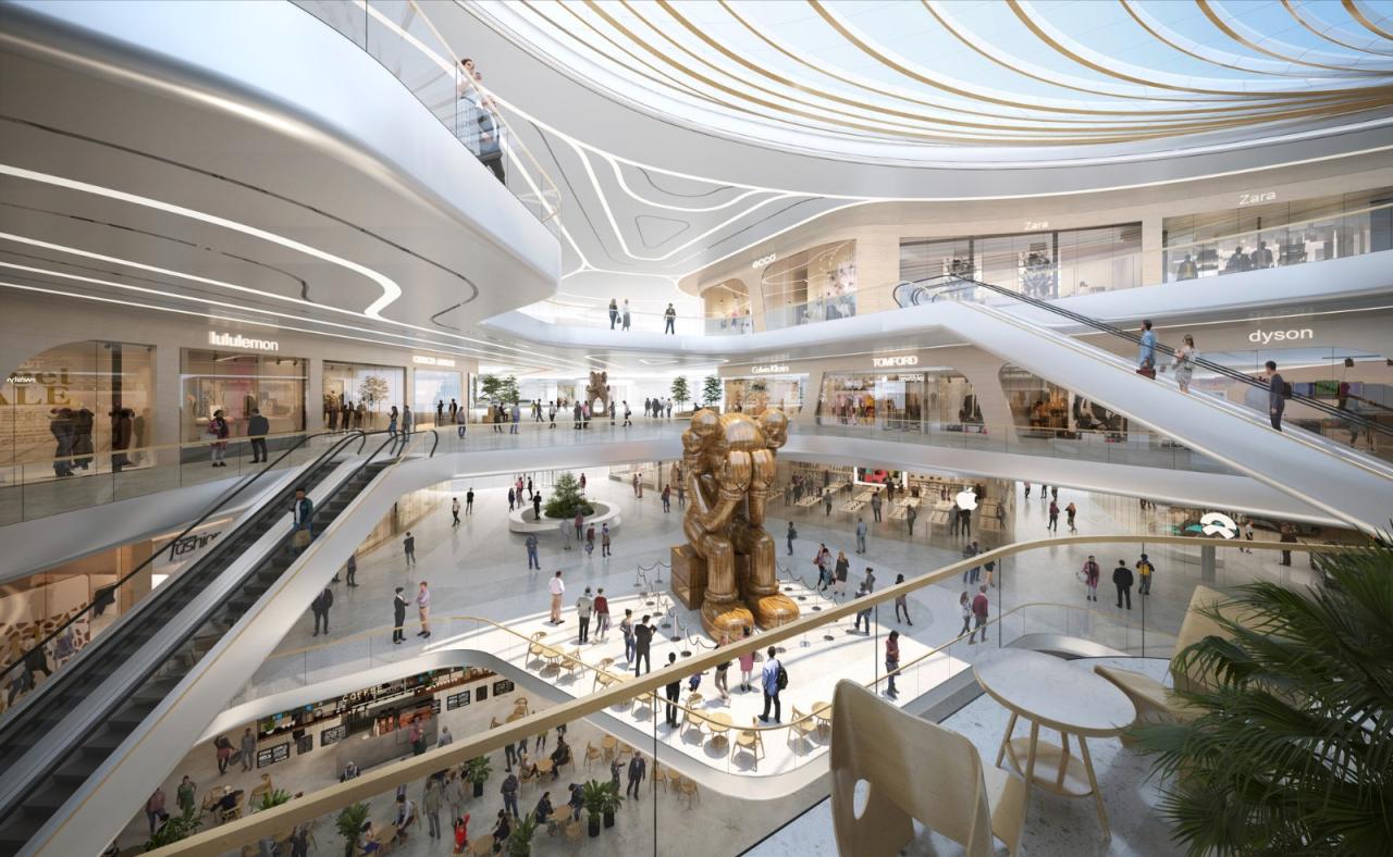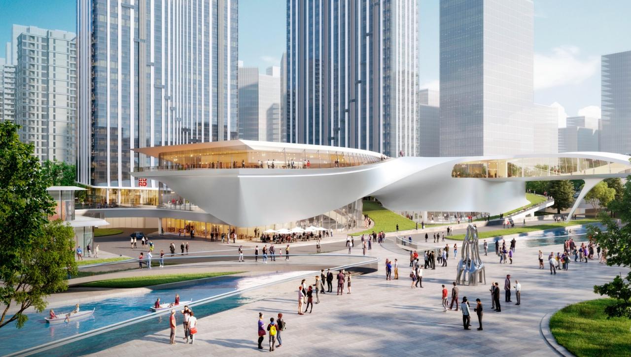 在设计中,高250米和150米的超高层办公塔楼毗邻中央河道北侧并整齐布局,以直冲天际的金属线条展现动态建筑外形。而位于河道南侧的4座塔楼包含酒店式公寓、总部办公和高端酒店。此外,设计融合滨水绿色公共空间、低密度商业裙房和文化场馆,勾画出由中间向两边渐高的城市轮廓线。在嘉华G72的整体策略中,一条绿色走廊延伸至裙楼以及街区,多维度地将社区融于生态环境,持续为城市创建福祉。这些鼓励社交互动、活动举办、创意迸发的绿色公共平台,允许大楼用户、游客、创意人士等在此体验健康创新的生活方式,给予快节奏生活一处闲暇静谧圣地。