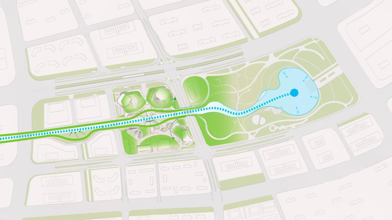 嘉华G72的方案旨在成为中国可持续发展和前瞻性设计的里程碑。创造福祉是我们设计的核心,同时引入科技打造低碳、健康和灵活自适的建筑和空间。在设计之初项目就采用主动式节能技术,以及自然通风、HVAC系统、太阳能光伏板(屋顶或外墙)、雨水管理系统、中水系统等结合作用以降低建筑能耗。办公塔楼还将应用预制部件以及模块化支撑结构,加强适应性。此外, 应用于所有建筑屋顶的BIPV(光伏建筑一体化)解决方案将在产能和节源上表现出更高的性能,提供建筑内日常所需能源并且进一步降低运营和维护成本,未来也计划应用于UCCA尤伦斯当代艺术中心幕墙中。因项目拥有独特的中轴水系,设计巧妙地引入雨水管理系统促进雨水收集灌溉,构成健康的生态系统。作为未来综合发展项目的典范,项目设计集成了智能建筑系统,有助于高效整合资源和应对未来各种变化和风险。嘉华G72综合发展的可持续设计也旨在实现低碳环境。项目设计多层次的交通网路,包括与地下公共交通的贯通,不仅为游客带来便捷,还进一步促进公共交通的使用并且增加区域可达性。同时设计与车道相分离的河岸人行步道和环形景观天桥,联通各个地块和业态,鼓励人们多行走。这些设计策略进而满足项目所在片区TOD开发的需求,将共同助力中国在2060年实现碳中和的目标。