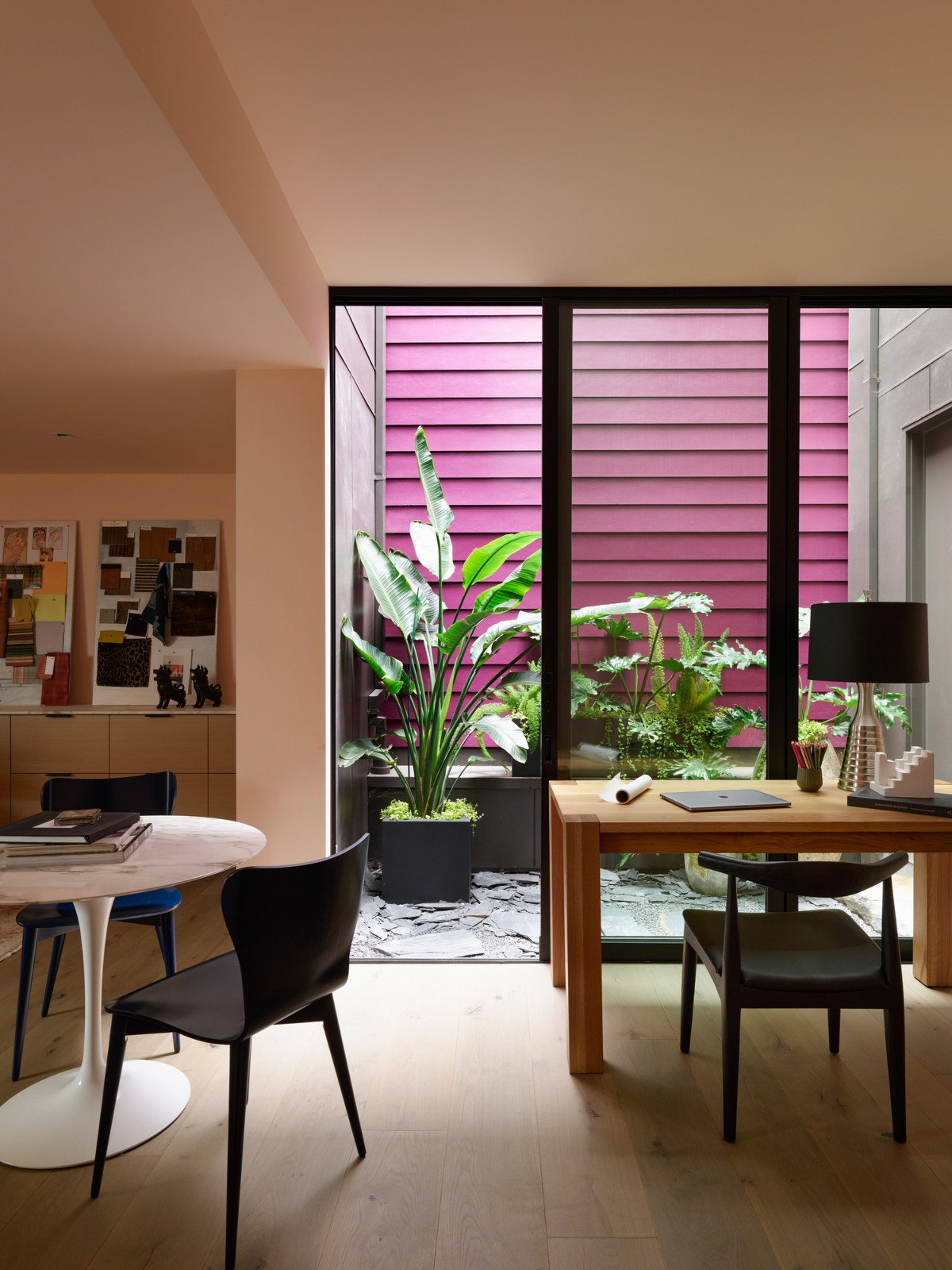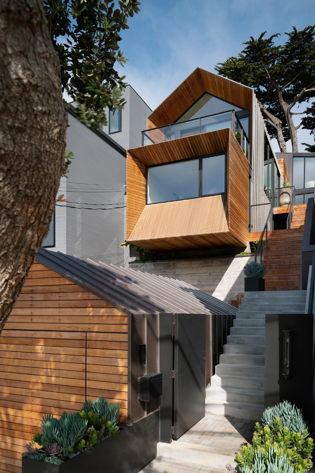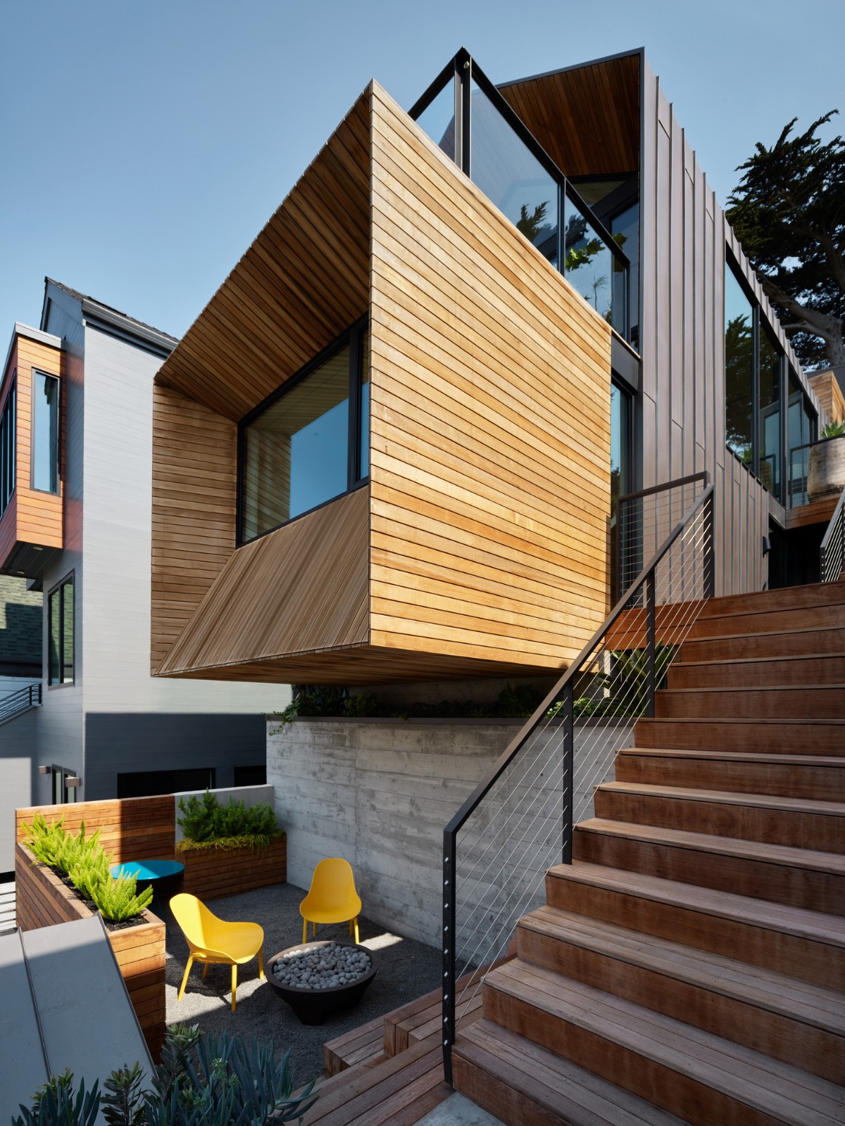 房屋的形式相互交织,突出的是雪松、固定接缝金属和水泥面板的材料调色板。这些形式,连同内部的调色板,在一个完全开放的平面内创造了房间。逐渐增强的形式出现在前端,向典型的旧金山乡土建筑致敬。