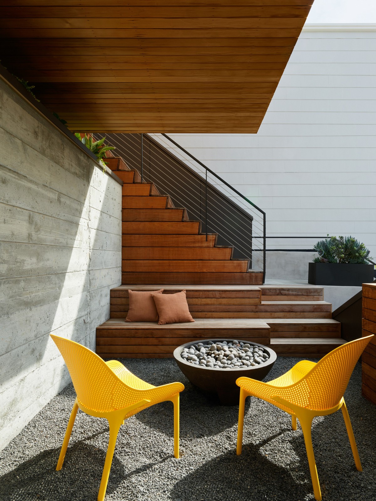 一个“倒置”的飘窗盒子从立面上悬臂 8 英尺,突出了“城市森林”的三种体验。下方是森林地面的外部火坑。在内部,盒子框定了“主干”层的视图。在上面,屋顶的平台延伸了客厅,让人们体验到“遮篷”的水平。在这个平台上,背景是几乎像孩子一样表达的家,山墙。
