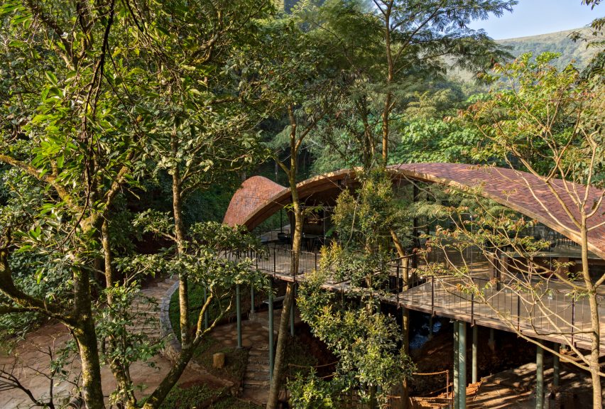 这座建筑坐落在一条狭窄的溪流上方,采用回收利用的钢柱支撑,为这座占地10英亩的度假村提供内部和外部用餐区。该项目已入围2022年Dezeen awards奖酒店建筑类别。“比赛工作室”的这个项目坐落在萨克勒什浦尔(Sakleshpur)的森林中,享有西高兹山脉(Western Ghats)的广阔视野,它试图创造一种形式,利用当地材料和劳动力,将其“无缝地编织和融合”到景观中。