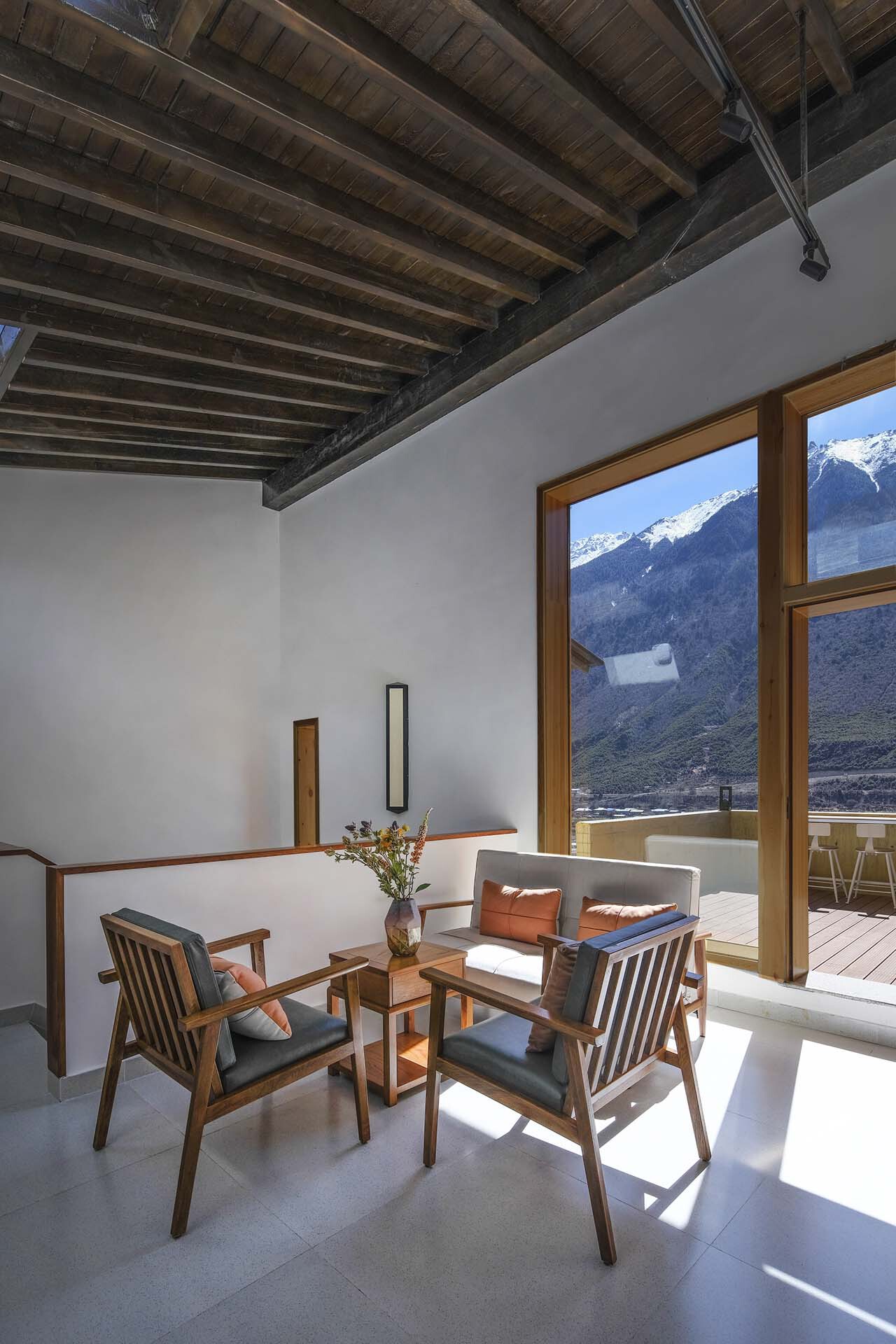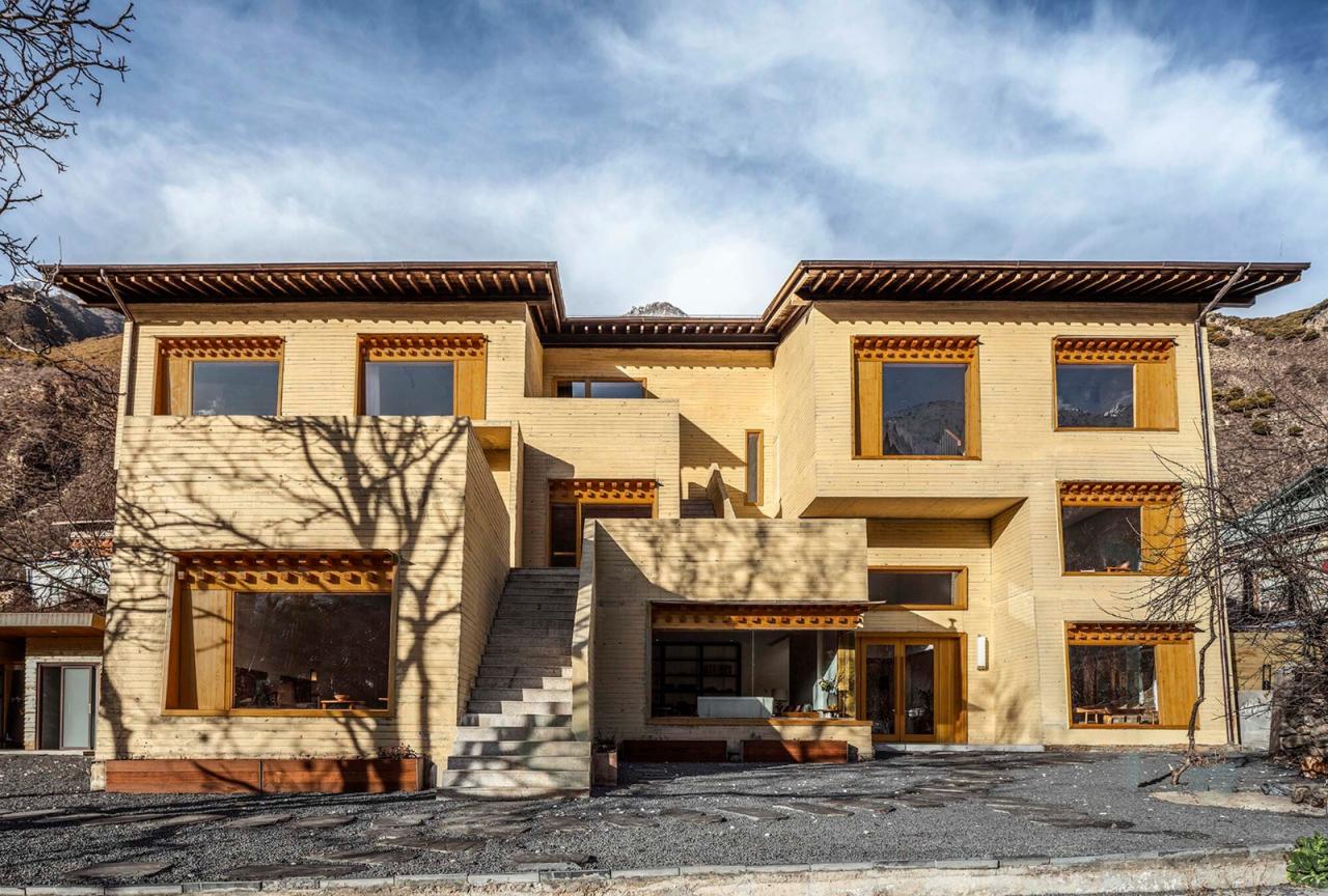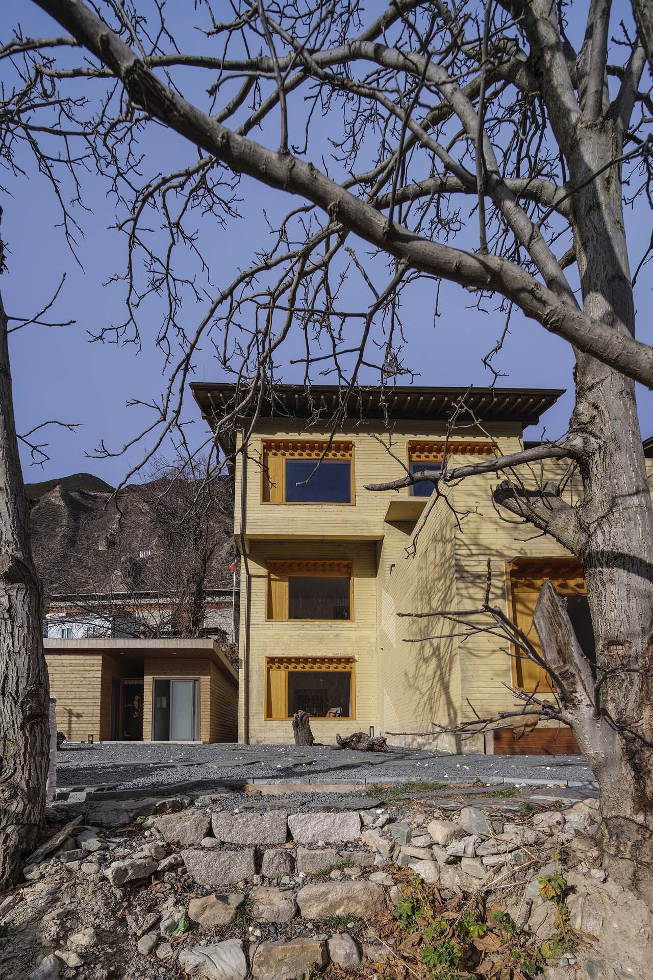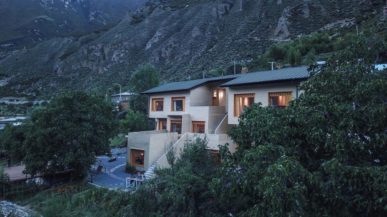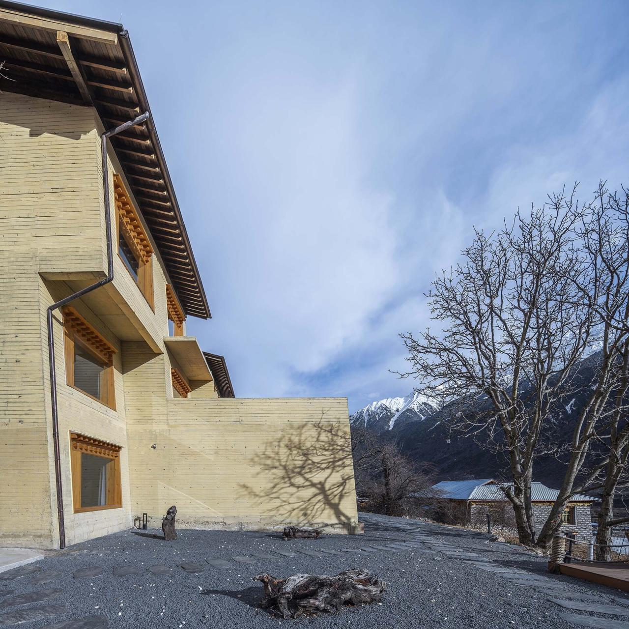 如果说在藏式建筑中佛堂是精神生活的中心,那传统的火炉和烹饪就是世俗生活的中心。嘎玛溪卡的厨房与用餐区在一层的西侧最核心的位置,作为民宿主人与客人们聚餐交流的场所。在原藏式民居基础上历时三年新建而成的嘎玛溪卡提供了九间大小不一错落分布的民宿房间,每个房间面向独特视角的自然景观。大面积的采光玻璃,将建筑对面的雪山、河谷白塔景观纳入室内。阶梯型的土色碉房空间形态,让建筑在获得不同景观视野的同时,自身也成为村落景观的一部分,成为旅途中的人们从G349国道路过于远处半山腰的一处灯塔,传递着一种光明、开放的空间精神。