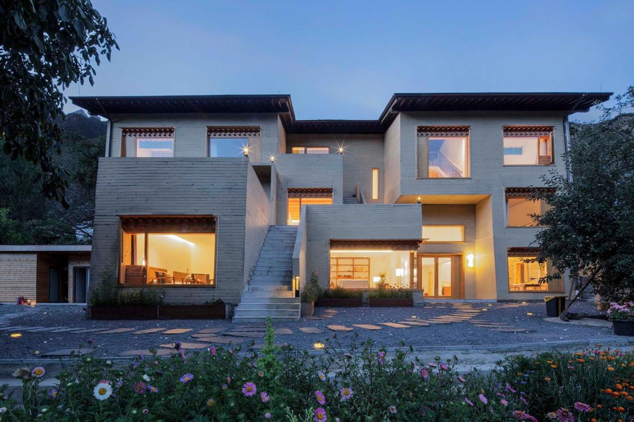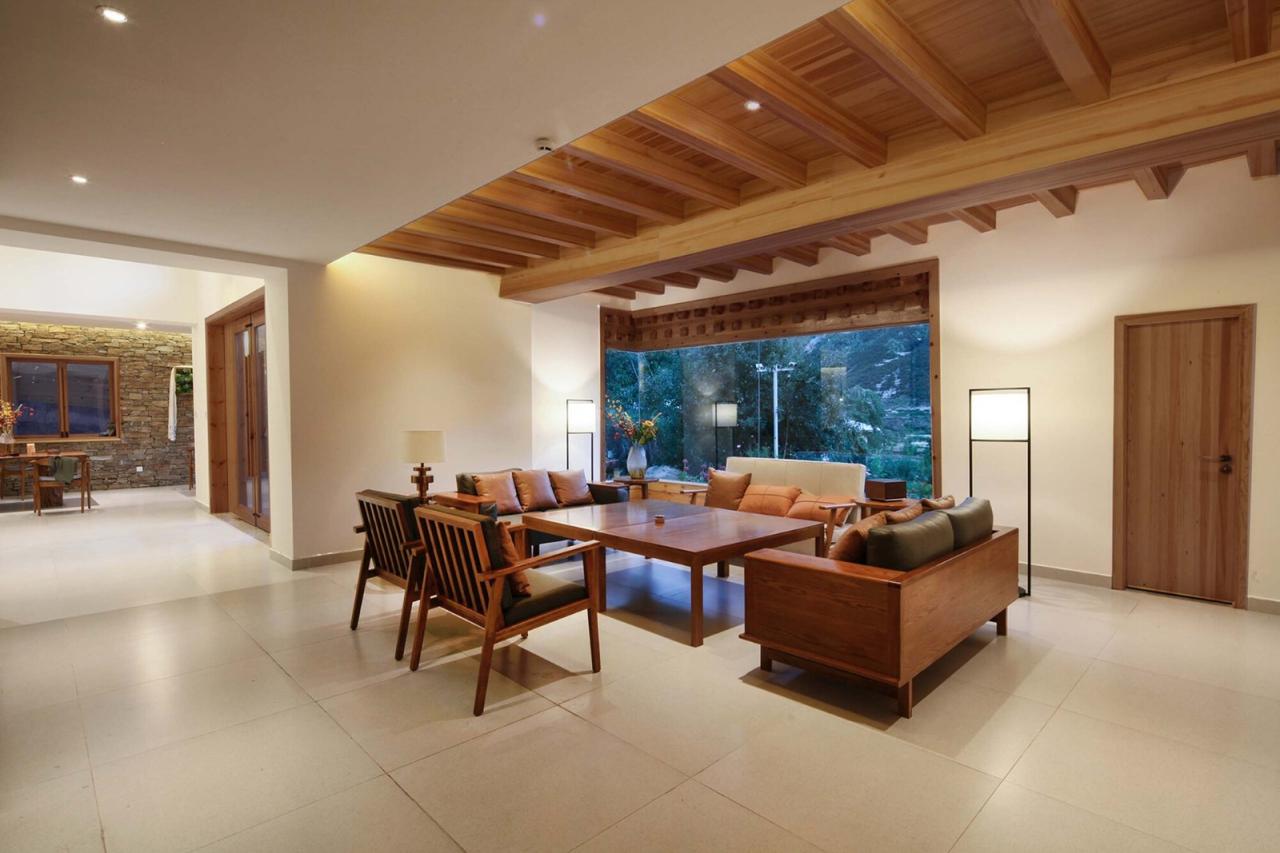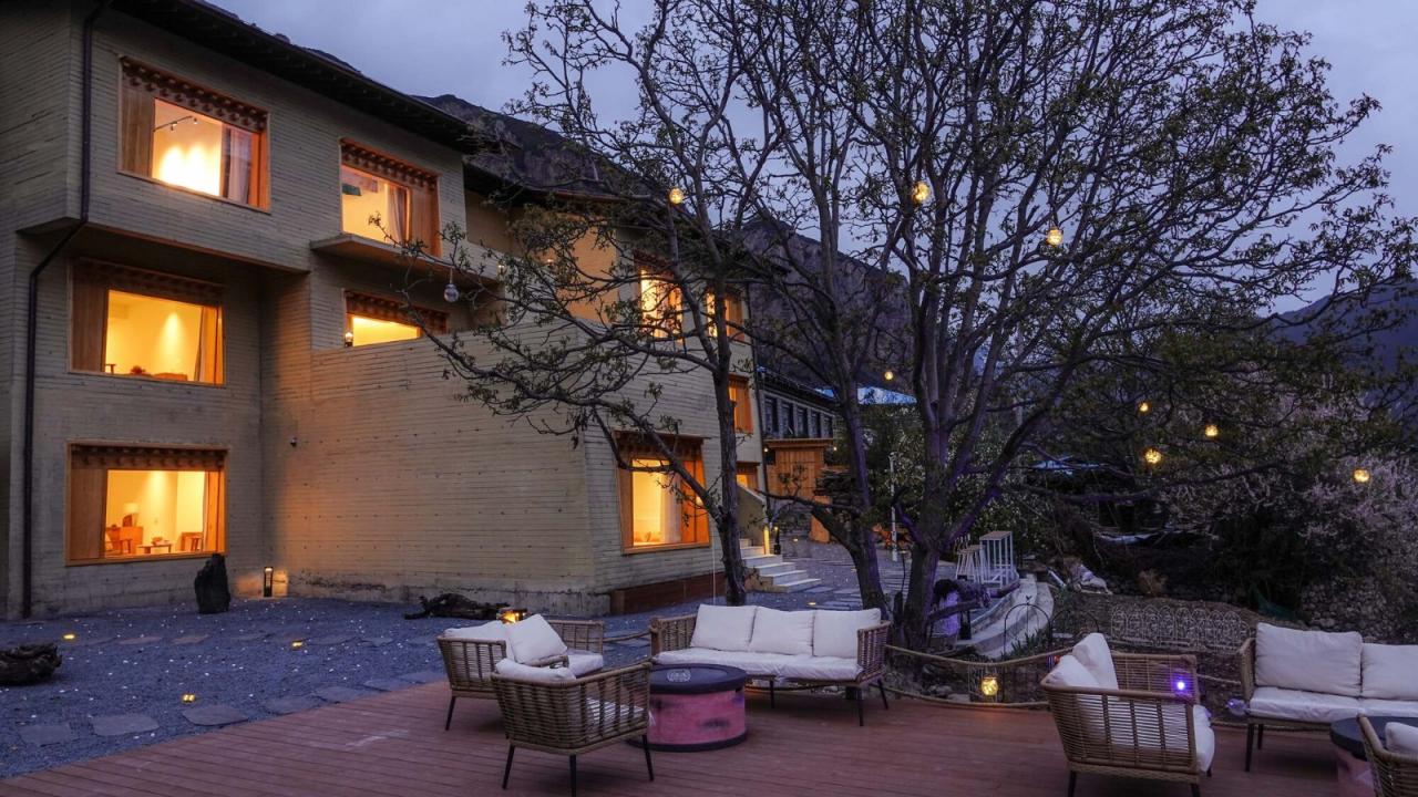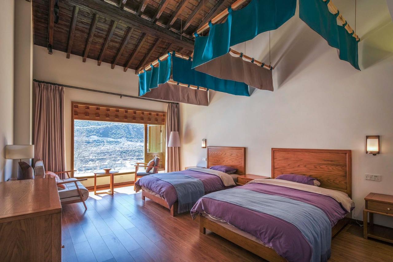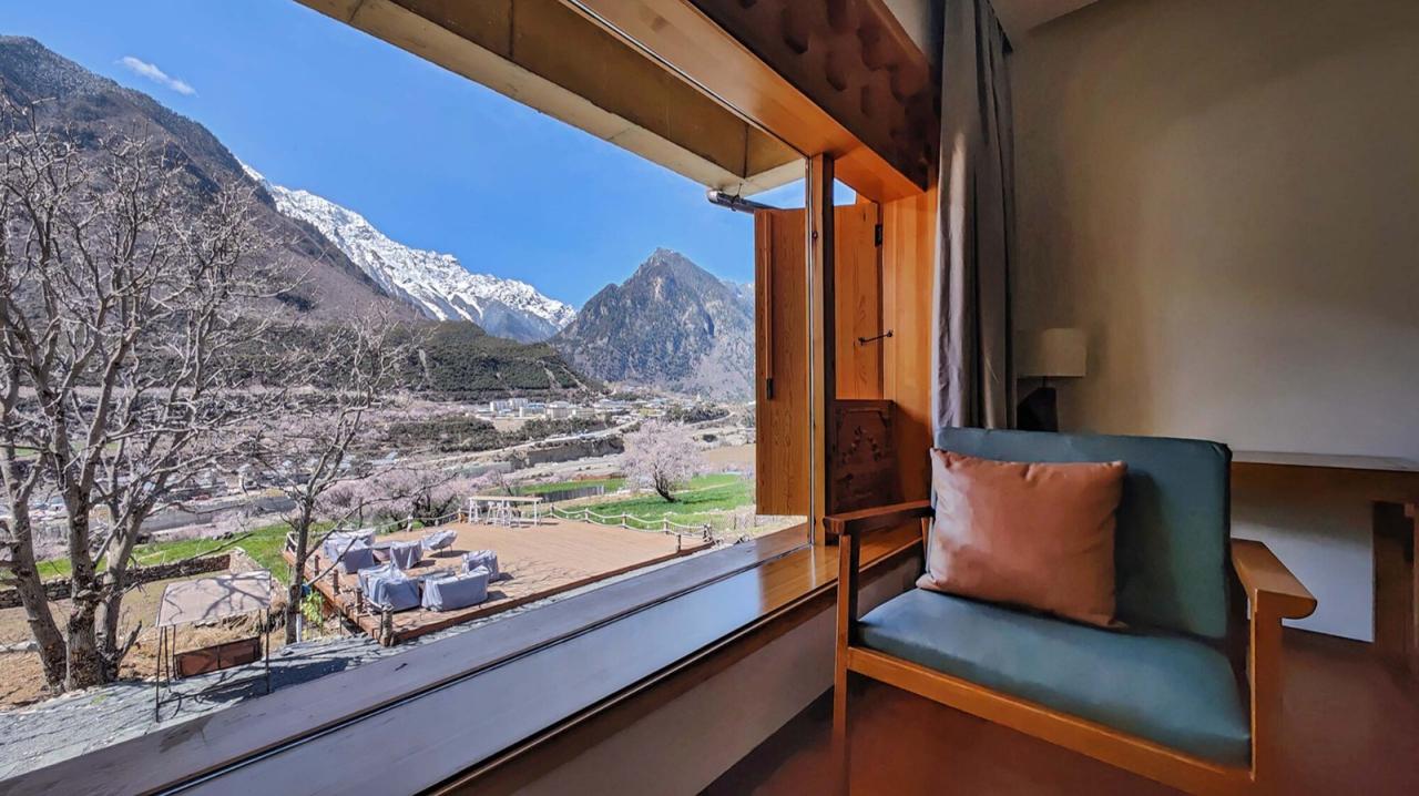 如果说在藏式建筑中佛堂是精神生活的中心,那传统的火炉和烹饪就是世俗生活的中心。嘎玛溪卡的厨房与用餐区在一层的西侧最核心的位置,作为民宿主人与客人们聚餐交流的场所。在原藏式民居基础上历时三年新建而成的嘎玛溪卡提供了九间大小不一错落分布的民宿房间,每个房间面向独特视角的自然景观。大面积的采光玻璃,将建筑对面的雪山、河谷白塔景观纳入室内。阶梯型的土色碉房空间形态,让建筑在获得不同景观视野的同时,自身也成为村落景观的一部分,成为旅途中的人们从G349国道路过于远处半山腰的一处灯塔,传递着一种光明、开放的空间精神。