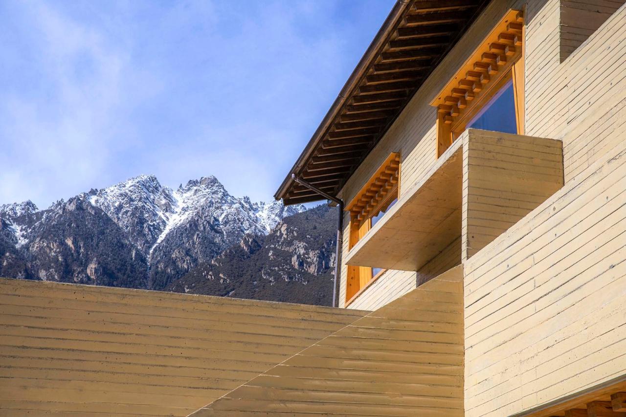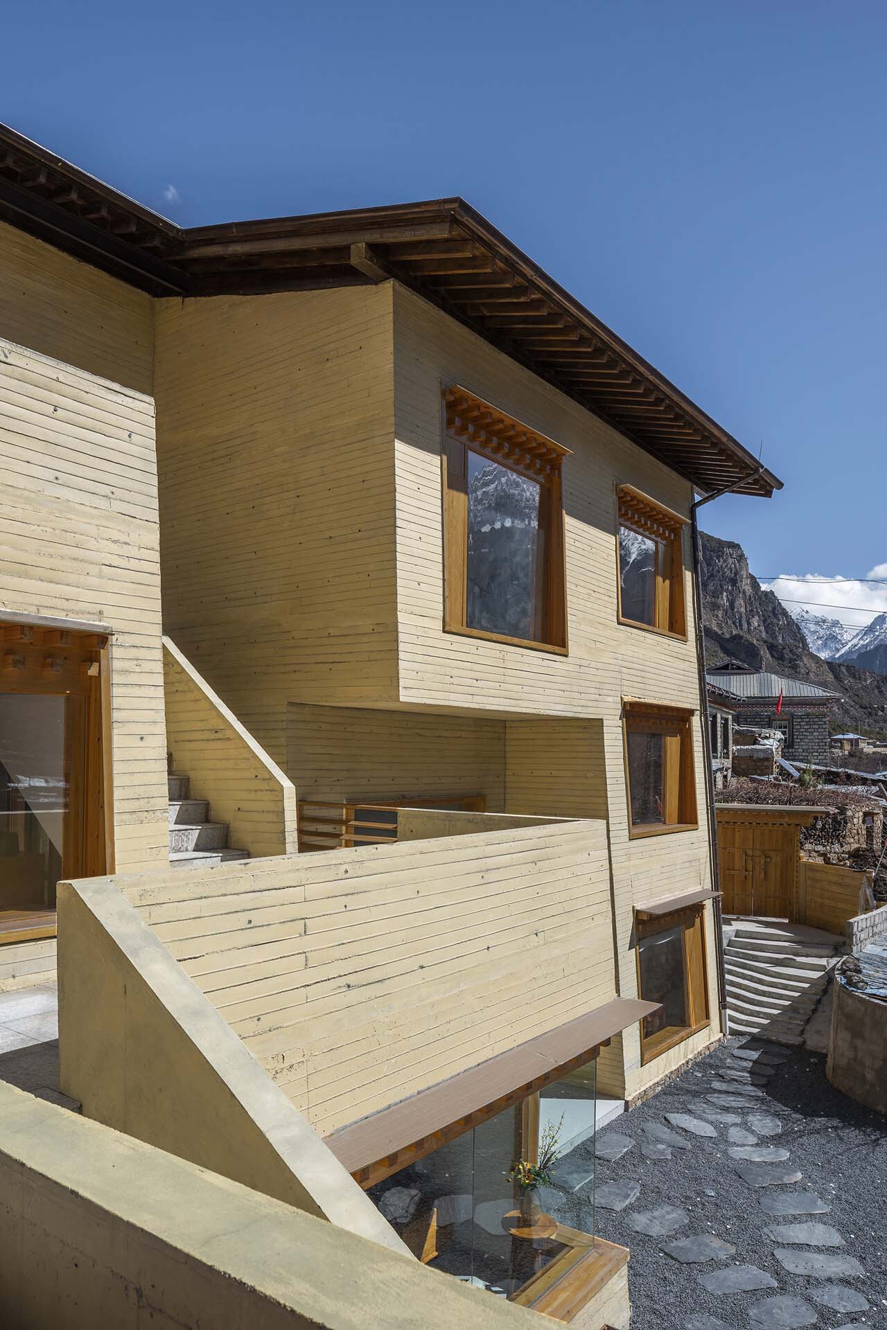 由于新建筑的场地被本土民居所围绕,即在聚落生态中建造新藏式建筑,设计需要在新与旧、传统与当代、手工与工业之间找到某种平衡。首先,嘎玛溪卡的建筑形体学习并顺应了尼屋当地的5º收分墙的传统,用现浇混凝土方式进行剪力墙结构方式的砌筑。其次,结合保温和耐候性较高的铝镁锰板坡屋顶形式,回应蓝色彩钢顶的强势,纪念逐步被替代的传统屋顶。再者,创造内外两个交通系统,进而沟通传统与现代的生活理念。利用这三个设计概念,新建筑试图创造一种“熟悉的陌生感”,以此来回应之前所提出来的三个平衡的问题。