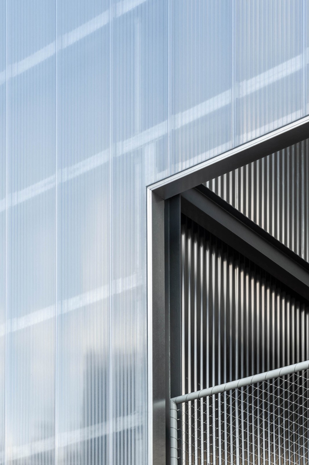 后方立面允许充足的光线进入工作空间和休息区。白天,外覆层反映了天空和外部环境不断变化的颜色,而在夜间的灯光着揭示了室内活动。