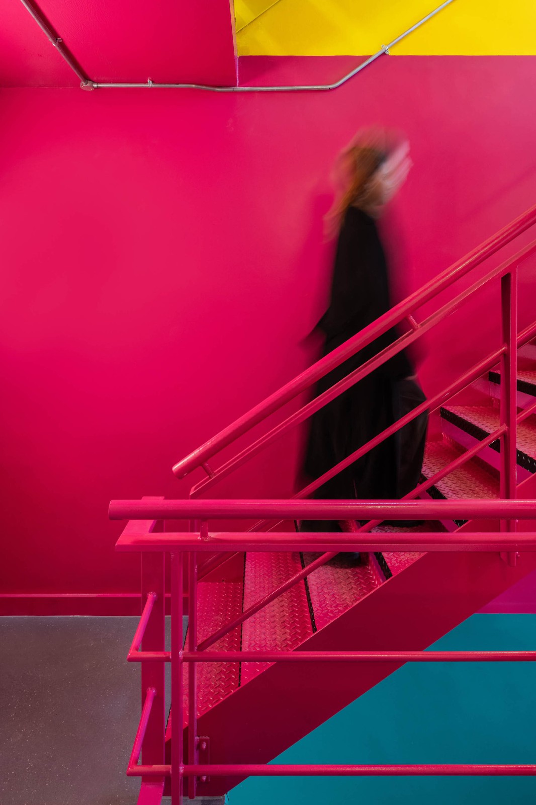 通过提供新的全玻璃入口,保留和改善的原有入口进入新建筑,[Y/N] Studio设计了新的品牌与标识。现有的楼梯间和入口处根据“CMYK”印刷颜色范围重新粉刷成青色、品红色、黄色和黑色,可以采用四种简单且对比鲜明的颜色组合来创作任何艺术品。