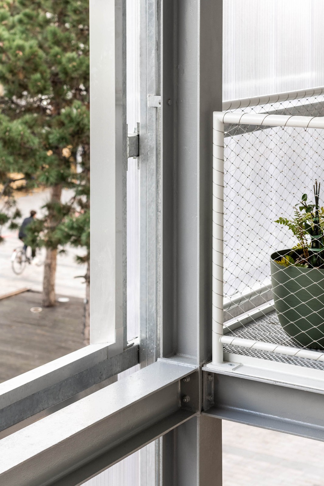 最后,这座建筑被包裹在一个同材质的聚碳酸酯立面中,并配有精轧铝基座和屋顶。轻盈且反光的表皮营造出一种独特的外观,然而从外部仔细观察,材料的半透明特性使白漆砖立面与露台仍然朦胧可见。
